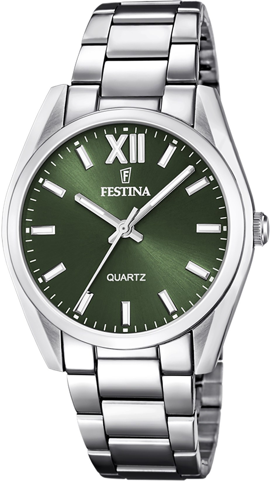 Festina Boyfriend Collection 20622/4 to damski zegarek na baterie o klasycznym designie ze stalową bransoletą, odpowiedni do noszenia na co dzień. Koperta z polerowanej stali nierdzewnej ma średnicę 36,8 milimetra. Ciemnozielona tarcza ze szlifem słonecznym jest chroniona trwałym szkłem mineralnym. Zastosowane indeksy godzinowe i wskazówki posiadają powłokę luminescencyjną, która gwarantuje doskonałą czytelność w warunkach słabego oświetlenia. Napęd zapewnia mechanizm kwarcowy Miyota 2035. Wodoodporność zegarka wynosi 5 ATM , dzięki któremu jest odporny na zachlapania i zachlapania i opady.
