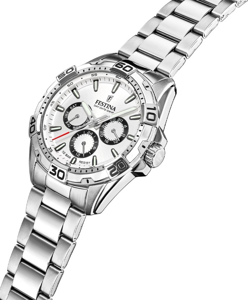 Festina Multifunction 20623/1 to klasyczny męski wielofunkcyjny zegarek na baterię na stalowej bransolecie ze składanym zapięciem. Koperta ze stali nierdzewnej ma średnicę 44,7 milimetra. Srebrna tarcza ze szlifem słonecznym, datownikiem, dniem tygodnia i formatem 24-godzinnym jest chroniona trwałym szkłem mineralnym. Wskazówki i indeksy posiadająpowłokę luminescencyjną, która po podświetleniu ułatwia odczyt w słabych warunkach oświetleniowych. Zegarek napędzany jest mechanizmem kwarcowym Miyota 6P29 z dokładnością ±20 sekund na miesiąc. Dzięki wodoszczelności 10 ATM zegarek nadaje się do pływania i snorkelingu.