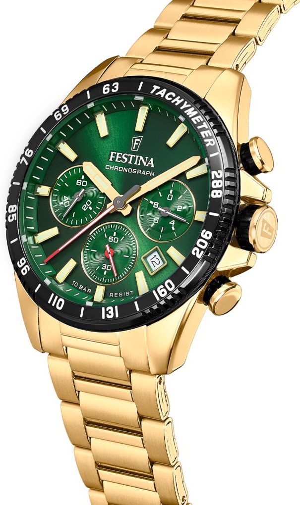 Festina Timeless Chronograph 20634/4 to męski sportowy zegarek na baterię na stalowej bransolecie z powłoką PVD w kolorze złota i składanym zapięciem. Koperta ze stali nierdzewnej w tym samym kolorze ma średnicę 45 milimetrów i czarną bezel ze skalą tachymetru. Zielona tarcza ze szlifem słonecznym, datownik i stoper są chronione szkłem mineralnym. Wskazówki i indeksy posiadają powłokę luminescencyjną, która po podświetleniu ułatwia czytelność w słabych warunkach oświetleniowych. Zegarek napędzany jest mechanizmem kwarcowym Miyota 6S20 z dokładnością ±20 sekund na miesiąc. Dzięki wodoodporności 10 ATM zegarek nadaje się do pływania i snorkelingu.