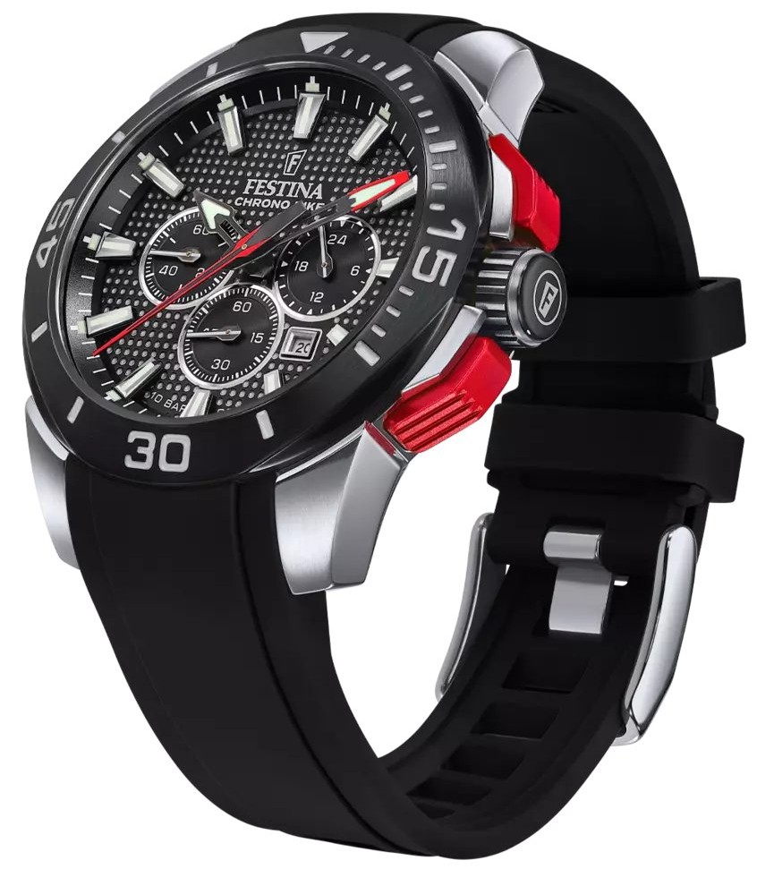 Legendarna kolekcja męskich zegarków sportowych Festina, którą charakteryzuje dynamiczny wygląd i odważna kolorystyka. Wszystkie modele wykonane są ze stali nierdzewnej lub tytanu, są wodoszczelne do 100 metrów i posiadają funkcję chronografu. Zegarek nadaje się zarówno dla zapalonych rowerzystów, jak i do noszenia na co dzień w miejskiej dżungli.