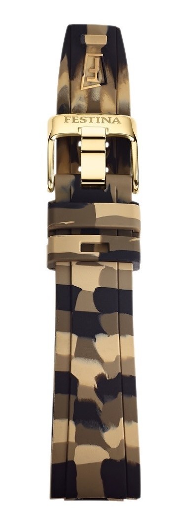 Festina Chrono Bike Special Edition 20644/1 to męski sportowy zegarek kwarcowy na metalowej bransolecie z wykończeniem PVD w kolorze czarnym, będący połączeniem wyrafinowanej estetyki i zaawansowanej funkcjonalności. Koperta ze stali nierdzewnej w kolorze złotym ma średnicę 47 milimetrów i bezel ze skalą minutową. Czarna tarcza ze złotymi detalami jest chroniona wytrzymałym szkłem mineralnym. Zastosowane indeksy wraz ze wskazówkami posiadają powłokę luminescencyjną, która po podświetleniu ułatwia czytelność w warunkach słabego oświetlenia. Zegarek zasilany jest mechanizmem kwarcowym Miyota 0S20 z niecentryczną wskazówką sekundową na godzinie 6, 24-godzinnym wyświetlaczem czasu na godzinie 3 oraz licznikiem minut na godzinie 9. Jest też okienko daty. Wodoodporność zegarka wynosi 10 ATM i dlatego nadaje się do pływania i snorkelingu. Jest to edycja specjalna, w której opakowaniu znajduje się zapasowy pasek silikonowy w kolorze brązowym ze wzorem kamuflażowym.