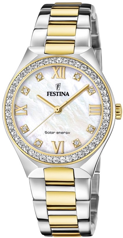 Festina Solar Energy 20659/1 to klasyczny damski zegarek na stalowej dwukolorowej bransolecie ze składanym zapięciem. Koperta ze stali nierdzewnej ma średnicę 35 milimetrów. Centralne części bransoletki, bezel i koronka zostały pokryte powłoką PVD w kolorze złotym. bezel i tarczę zdobią przezroczyste cyrkonie. Tarcza z masy perłowej chroniona jest wytrzymałym szkłem mineralnym, a jej piękno uwydatnia się szczególnie w bezpośrednim świetle, kiedy możemy obserwować grę barw masy perłowej. Zegarek zasilany jest mechanizmem baterii Miyota 2070 zasilanym energią słoneczną i dokładnością ±20 sekund na miesiąc. Wodoodporność zegarka wynosi 5 ATM, dzięki któremu jest odporny na zachlapania i zachlapania i opady.