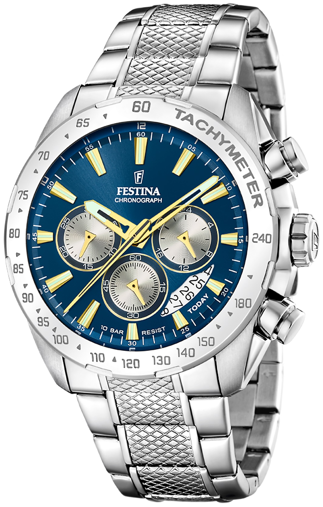 Festina Timeless Chronograph 20668/5 to męski sportowy zegarek na baterię na stalowej bransolecie ze składanym zapięciem. Koperta ze stali nierdzewnej ma średnicę 44,5 milimetra i bezel ze skalą tachymetru. Niebiesko-srebrna tarcza z datą, stoperem i wskaźnikiem czasu w formacie 24-godzinnym jest chroniona szkłem mineralnym. Wskazówki i indeksy posiadają powłokę luminescencyjną, która po podświetleniu ułatwia czytelność w słabych warunkach oświetleniowych. Zegarek napędzany jest mechanizmem kwarcowym Miyota JS25 z dokładnością ±20 sekund na miesiąc. Dzięki wodoodporności 10 ATM zegarek nadaje się do pływania i snorkelingu.
