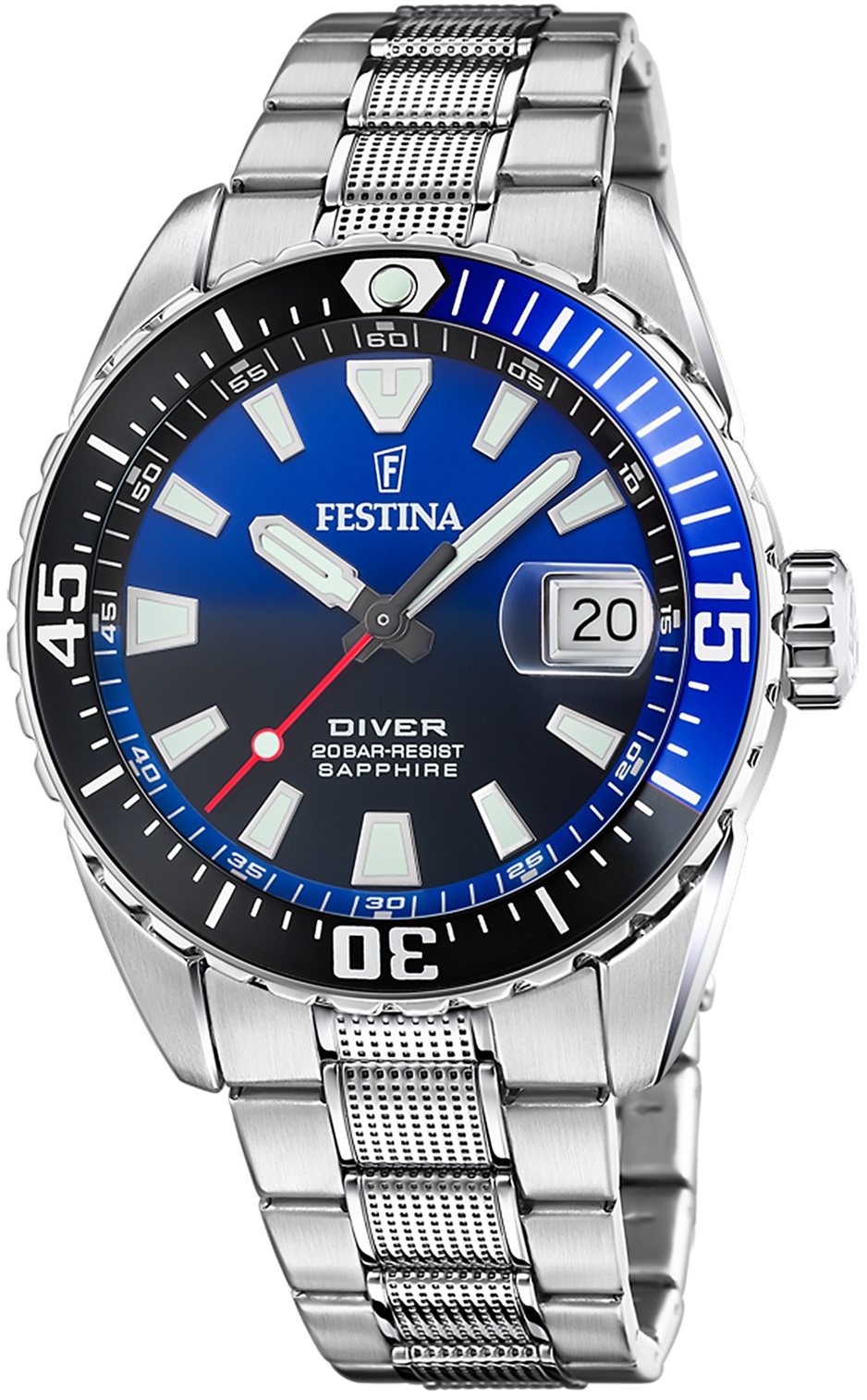 Festina The Originals 20669/5 to męski sportowy zegarek kwarcowy na stalowej bransolecie ze składanym zapięciem. Koperta ze stali nierdzewnej ma średnicę 41 milimetrów i zakręcaną koronkę. Gradientowa niebiesko-czarna tarcza jest chroniona wytrzymałym szkłem szafirowym ze szkłem powiększającym nad datownikiem. Zastosowane indeksy oraz wskazówki posiadają powłokę luminescencyjną, która po naświetleniu ułatwia odczyt w warunkach słabego oświetlenia. Zegarek zasilany jest mechanizmem baterii Miyota 2315 z dokładnością ±20 sekund na miesiąc. Wodoodporność zegarka wynosi 20 ATM i dlatego nadaje się do głębokiego nurkowania.