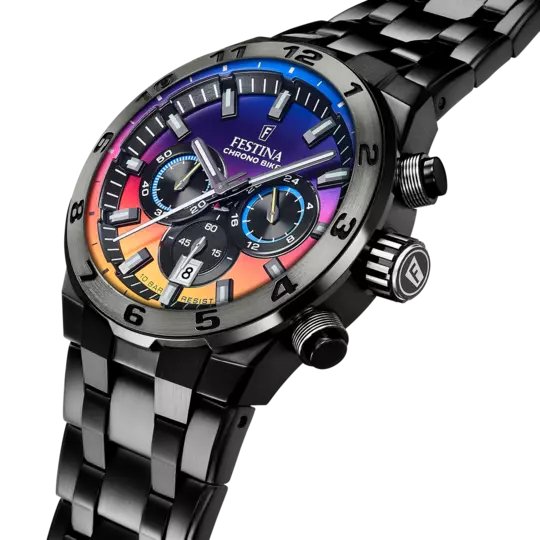 Festina Chrono Bike Limited Edition 20674/1 to męski sportowy zegarek kwarcowy na metalowej bransolecie z wykończeniem PVD w kolorze czarnym, będący połączeniem wyrafinowanej estetyki i zaawansowanej funkcjonalności. Jest to limitowana edycja 999 sztuk na całym świecie. Koperta ze stali nierdzewnej w tym samym kolorze ma średnicę 44,5 milimetra i bezel ze skalą godzinową. Tęczowa tarcza z czarnymi tarczami pomocniczymi jest chroniona trwałym szkłem mineralnym. Zastosowane indeksy oraz wskazówki posiadają powłokę luminescencyjną, która po naświetleniu ułatwia odczyt w warunkach słabego oświetlenia. Zegarek zasilany jest mechanizmem kwarcowym Miyota 0S20 z niecentryczną wskazówką sekundową na godzinie 6, 24-godzinnym wyświetlaczem czasu na godzinie 3 oraz licznikiem minut na godzinie 9. Jest też okienko daty. Wodoodporność zegarka wynosi 10 ATM i dlatego nadaje się do pływania i snorkelingu. W zestawie zapasowy czarny silikonowy pasek.