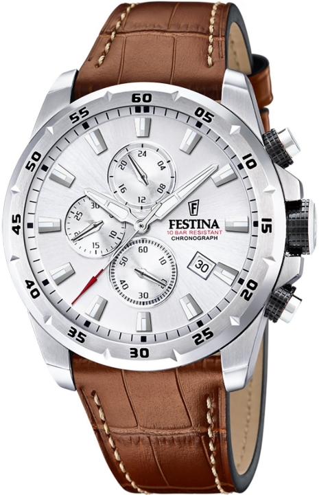 Festina Timeless Chronograph 20692/1 to męski, sportowy, elegancki zegarek na baterię na brązowym skórzanym pasku z kontrastowymi szwami i zapinaną na sprzączkę. Koperta ze stali nierdzewnej ma średnicę 45,05 milimetra i bezel ze skalą minutową. Srebrna tarcza z datą, stoperem i wskaźnikiem czasu w formacie 24-godzinnym jest chroniona szkłem mineralnym. Wskazówki i indeksy posiadają powłokę luminescencyjną, która po podświetleniu ułatwia czytelność w słabych warunkach oświetleniowych. Zegarek napędzany jest mechanizmem kwarcowym Miyota JS15 z dokładnością ±20 sekund na miesiąc. Dzięki wodoodporności 10 ATM zegarek nadaje się do pływania i snorkelingu.