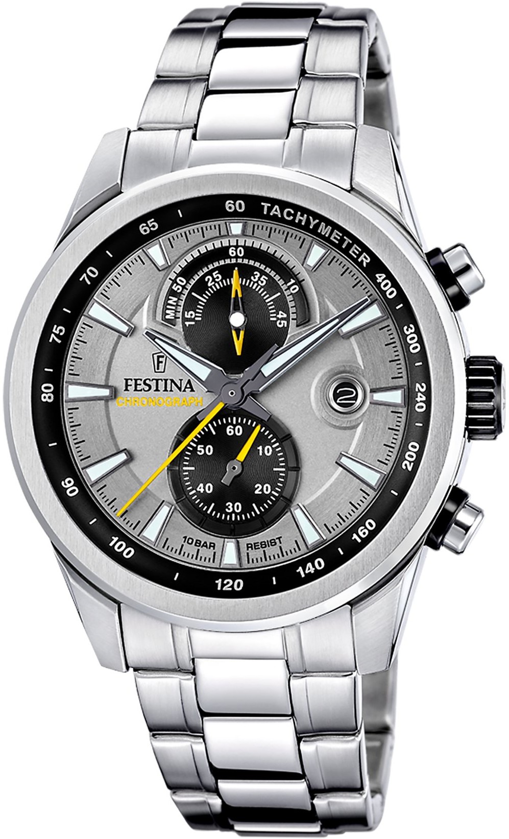 Festina Timeless Chronograph 20694/4 to męski sportowy zegarek na baterię na stalowej bransolecie ze składanym zapięciem. Koperta ze stali nierdzewnej ma średnicę 44 milimetrów i czarną bezel wewnętrzną ze skalą tachymetru. Szaro-czarna tarcza ze datownikiem i stoperem jest chroniona wytrzymałym szkłem mineralnym. Wskazówki i indeksy posiadają powłokę luminescencyjną, która po podświetleniu ułatwia czytelność w słabych warunkach oświetleniowych. Zegarek napędzany jest mechanizmem kwarcowym Miyota 0S11 z dokładnością ±20 sekund na miesiąc. Dzięki wodoodporności 10 ATM zegarek nadaje się do pływania i snorkelingu.