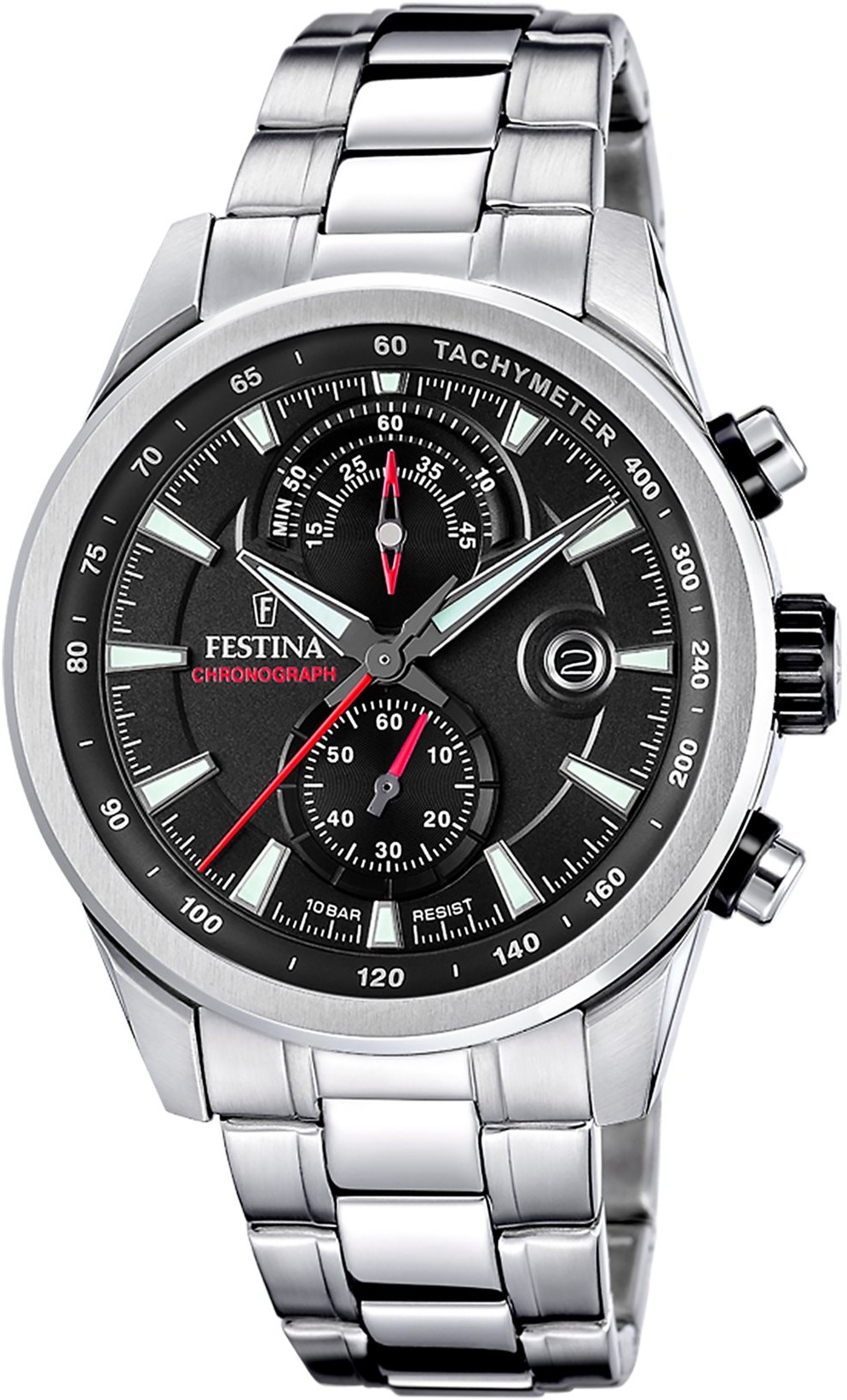 Festina Timeless Chronograph 20694/6 to męski sportowy zegarek na baterię na stalowej bransolecie ze składanym zapięciem. Koperta ze stali nierdzewnej ma średnicę 44 milimetrów i czarną bezel wewnętrzną ze skalą tachymetru. Czarna tarcza ze datownikiem i stoperem jest chroniona wytrzymałym szkłem mineralnym. Wskazówki i indeksy posiadają powłokę luminescencyjną, która po podświetleniu ułatwia czytelność w słabych warunkach oświetleniowych. Zegarek napędzany jest mechanizmem kwarcowym Miyota 0S11 z dokładnością ±20 sekund na miesiąc. Dzięki wodoodporności 10 ATM zegarek nadaje się do pływania i snorkelingu.