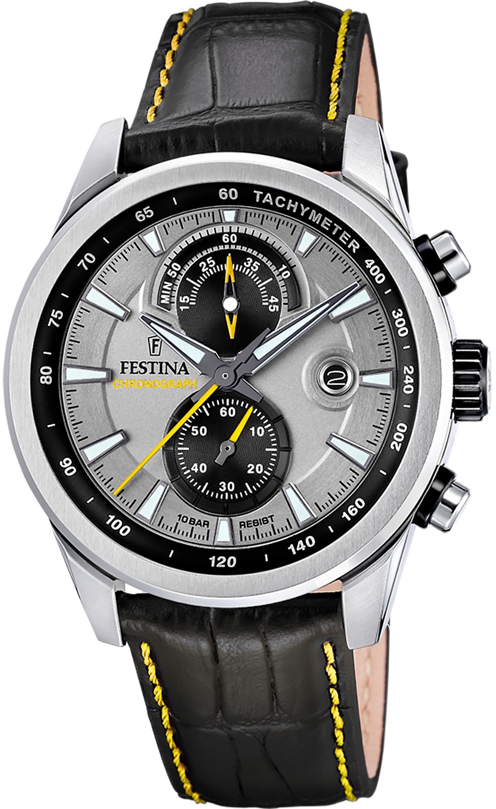Festina Timeless Chronograph 20695/4 to męski sportowy zegarek na baterię na czarnym skórzanym pasku z żółtymi przeszyciami i sprzączką. Koperta ze stali nierdzewnej ma średnicę 44 milimetrów i czarną bezel wewnętrzną ze skalą tachymetru. Szaro-czarna tarcza ze datownikiem i stoperem jest chroniona wytrzymałym szkłem mineralnym. Wskazówki i indeksy posiadają powłokę luminescencyjną, która po podświetleniu ułatwia czytelność w słabych warunkach oświetleniowych. Zegarek napędzany jest mechanizmem kwarcowym Miyota 0S11 z dokładnością ±20 sekund na miesiąc. Dzięki wodoodporności 10 ATM zegarek nadaje się do pływania i snorkelingu.