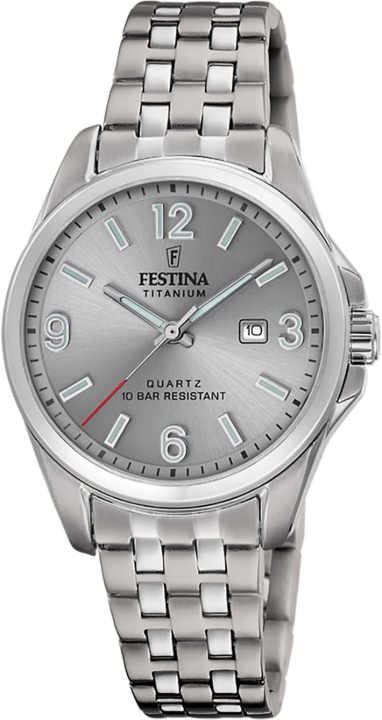 Festina Titanium Date 20697/2 to klasyczny damski zegarek na baterie na tytanowej bransolecie ze składanym zapięciem. Tytanowa koperta ma średnicę 31 milimetrów. Szara tarcza ze szlifem słonecznym i datownikiem na godzinie trzeciej jest chroniona wytrzymałym szkłem mineralnym. Wskazówki i indeksy posiadają powłokę luminescencyjną, która po podświetleniu ułatwia czytelność w słabych warunkach oświetleniowych. Zegarek napędzany jest mechanizmem kwarcowym Miyota GL12 z dokładnością ±20 sekund na miesiąc. Dzięki wodoodporności 10 ATM zegarek nadaje się do pływania i snorkelingu.