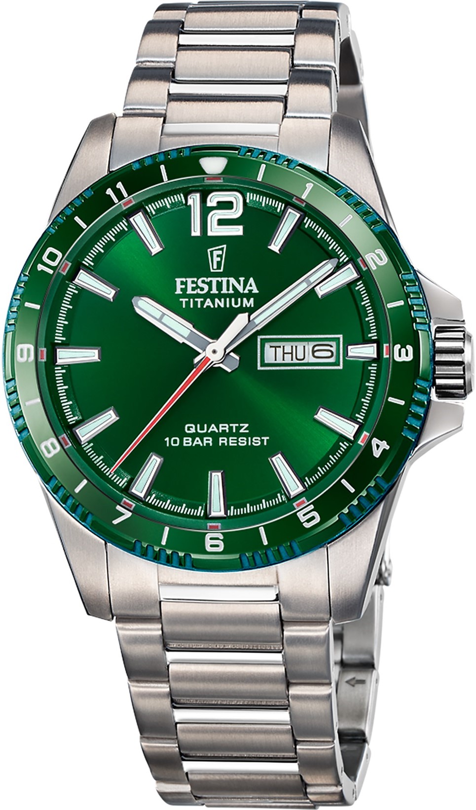 Festina Titanium 20698/3 to klasyczny męski zegarek na baterię na tytanowej bransolecie ze składanym zapięciem. Tytanowa koperta ma średnicę 43 milimetrów. Zielona tarcza ze szlifem słonecznym oraz wskaźnik daty i dnia tygodnia jest chroniona wytrzymałym szkłem mineralnym. Wskazówki i indeksy posiadają powłokę luminescencyjną, która po podświetleniu ułatwia czytelność przy słabym naświetleniu. Zegarek napędzany jest mechanizmem kwarcowym Miyota GR02. Dzięki wodoodporności 10 ATM zegarek nadaje się do pływania i snorkelingu.