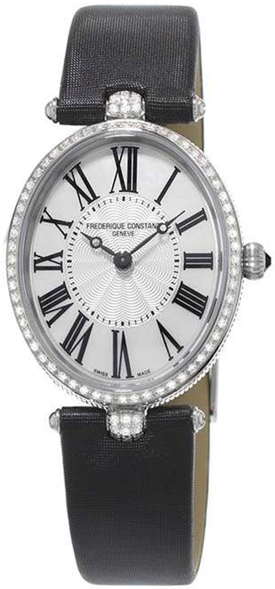 Frederique Constant Classics Art Deco FC-200MPW2VD6 to damski zegarek na baterię na czarnym skórzanym pasku ze sprzączką. Owalna koperta ze stali nierdzewnej wysadzana 78 diamentami o masie 0,40 ct ma średnicę 25 milimetrów i koronę ozdobioną niebieskim kaboszonem. Tarcza ze srebrnym giloszem pośrodku z kontrastującymi wskazówkami brequet jest chroniona wytrzymałym szkłem szafirowym. Czarne indeksy godzin w kształcie cyfr rzymskich podkreślone są obwodem tarczy z masy perłowej, której piękno szczególnie podkreśla się pod bezpośrednim światłem, kiedy możemy zaobserwować grę barw masy perłowej. Zegarek napędza niezawodny mechanizm kwarcowy FC-200 (bazujący na mechanizmie Ronda 1062). Dzięki wodoodporności 3 ATM zegarek jest odporny na wilgoć i zachlapania.