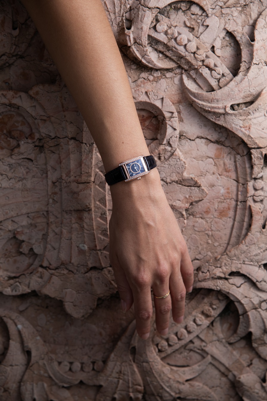Frederique Constant Classics Carrée Ladies FC-200NMCDCD14 to elegancki damski zegarek na baterię na niebieskim skórzanym pasku ze sprzączką. Kwadratowa koperta ze stali nierdzewnej z powłoką PVD w kolorze różowego złota ma wymiary 21 x 23 milimetry i jest ozdobiona 34 diamentami o masie 0,4 ct. Niebieska tarcza z giloszowym środkiem o fakturze „clous de Paris” otoczona 35 diamentami o masie 0,06 ct jest chroniona wytrzymałym szkłem szafirowym. Białe indeksy godzin w kształcie cyfr rzymskich uzupełniają eleganckie wskazówki łopatkowe w identycznym kolorze. Zegarek napędza niezawodny mechanizm kwarcowy FC-200, który jest wzorowany na Rondzie 1062. Dzięki wodoodporności 3 ATM, zegarek jest odporny na wilgoć i zachlapania.< /p>