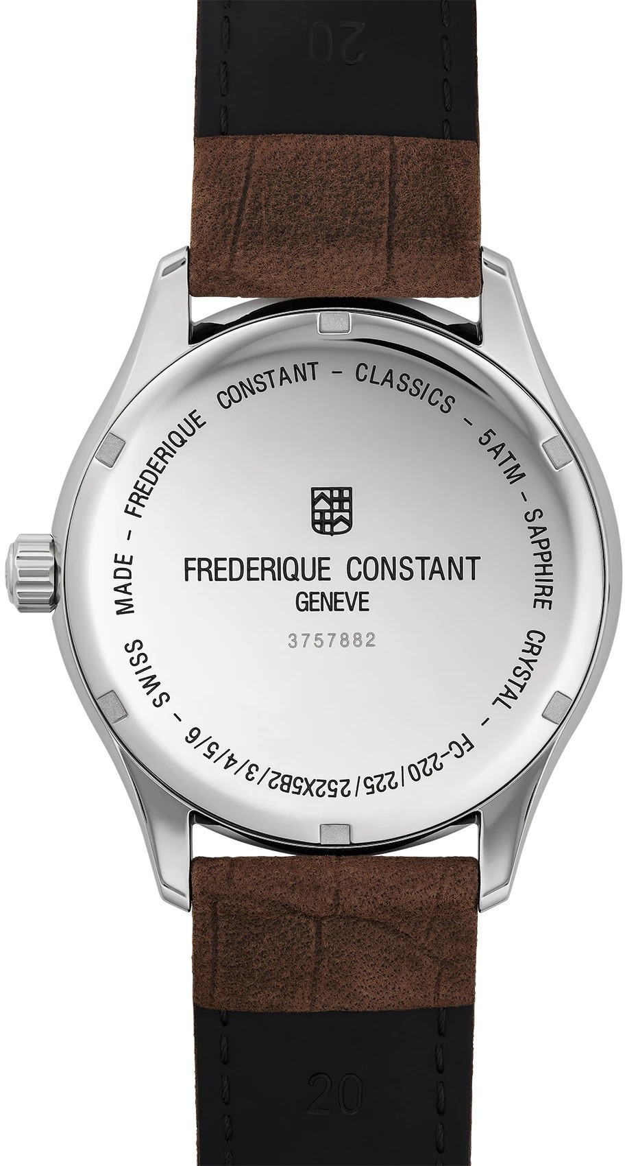 Frederique Constant Classics Quartz FC-220DGS5B6 to męski zegarek na baterię na brązowym skórzanym pasku z kontrastowymi szwami i zapinaną na zatrzask. Koperta ze stali nierdzewnej ma średnicę 40 milimetrów i sygnowaną koronkę. Ten elegancki zegarek jest odpowiednim wyborem do noszenia na co dzień. Antracytowa tarcza ze szlifem słonecznym i wskaźnikiem daty jest chroniona wytrzymałym szkłem szafirowym. Zastosowane indeksy godzinowe uzupełniają wskazówki pokryte powłoką luminescencyjną Super-LumiNova®, która gwarantuje doskonałą czytelność w warunkach słabego oświetlenia. Zegarek napędza niezawodny mechanizm kwarcowy FC-220 (bazujący na mechanizmie Ronda 515). Dzięki wodoodporności 5 ATM zegarek jest odporny na zachlapania i zachlapania i opady.