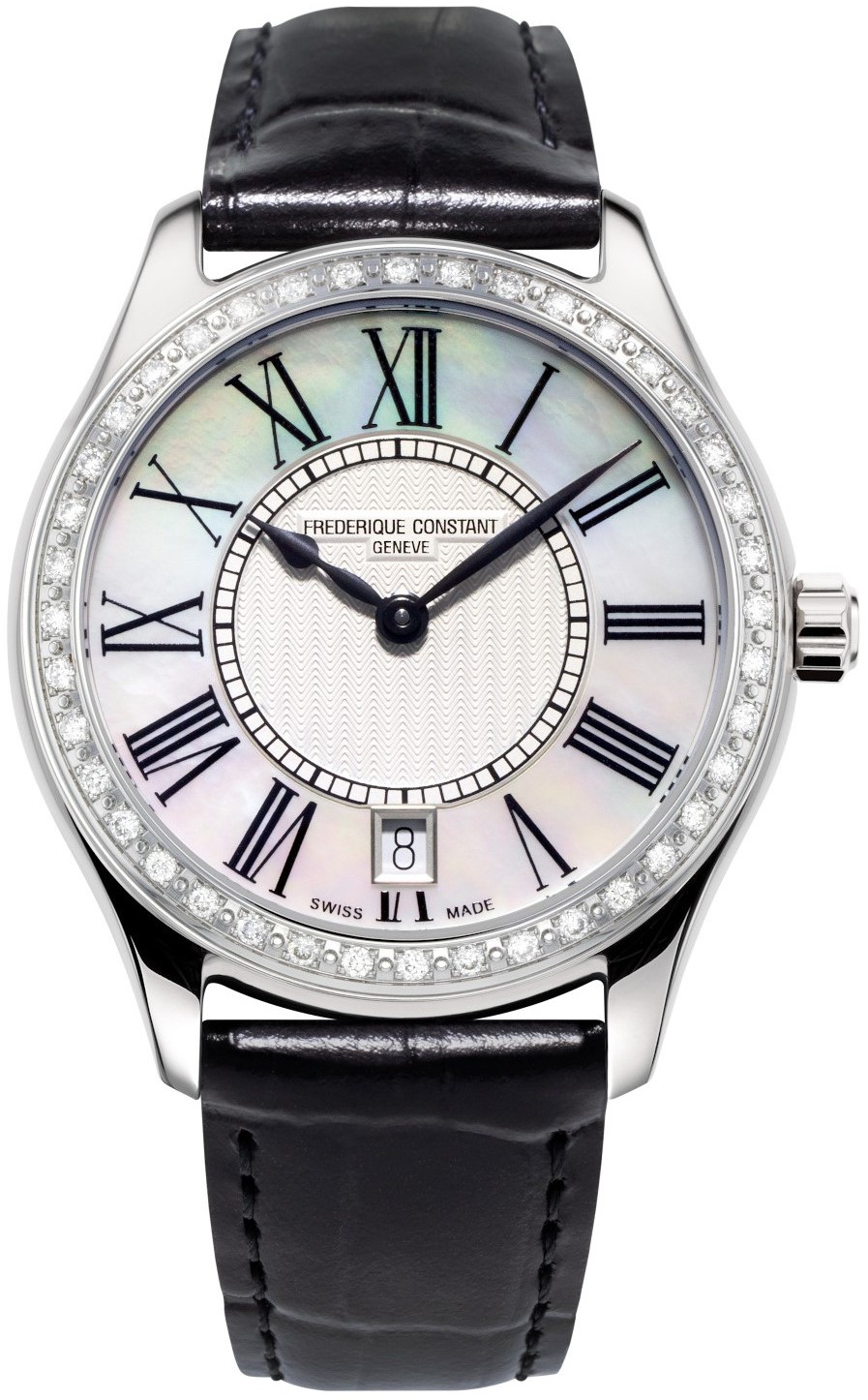 Frederique Constant Classics Ladies Quartz FC-220MPW3BD26 to damski zegarek na baterię na czarnym skórzanym pasku ze sprzączką. Koperta ze stali nierdzewnej ma średnicę 36 milimetrów, sygnowaną koronkę i bezel wysadzaną 40 diamentami o masie 0,47 ct. Tarcza z datownikiem i środkiem ozdobionym białym giloszem z kontrastowymi wskazówkami łopatkowymi jest chroniona wytrzymałym szkłem szafirowym. Czarne indeksy godzin w kształcie cyfr rzymskich podkreślone są obwodem tarczy z masy perłowej, której piękno szczególnie podkreśla się pod bezpośrednim światłem, kiedy możemy zaobserwować grę barw masy perłowej. Zegarek napędza niezawodny mechanizm kwarcowy FC-220 (bazujący na mechanizmie Ronda 515). Wodoodporność zegarka wynosi 5 ATM, dzięki któremu jest odporny na zachlapania i zachlapania i opady.