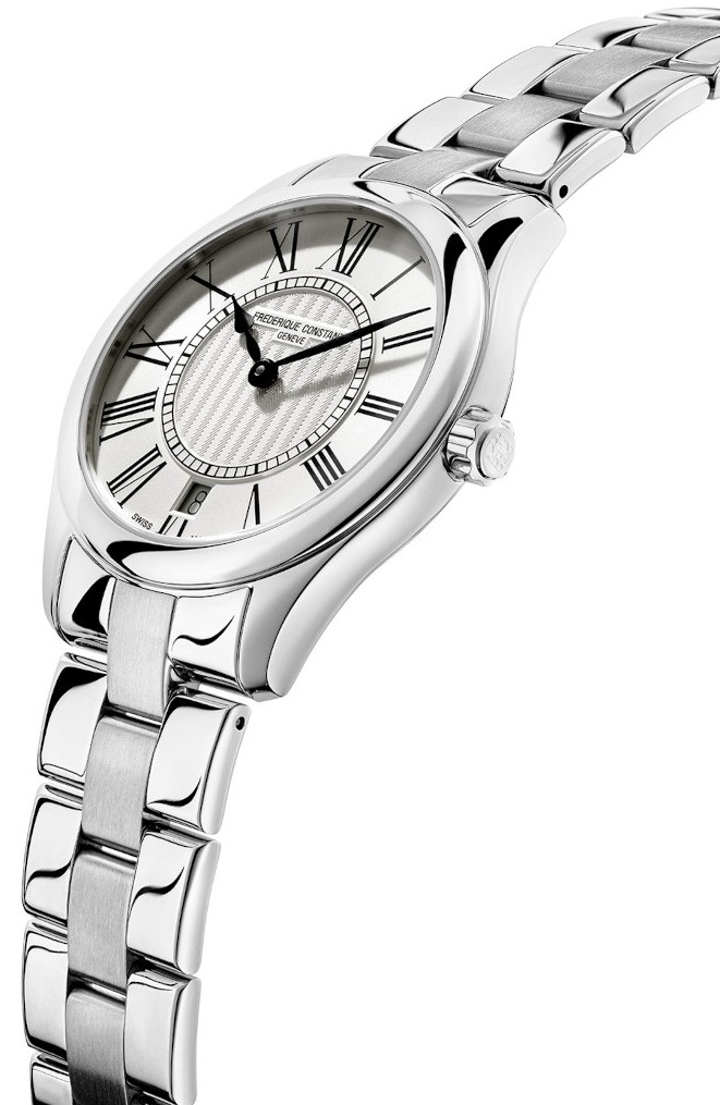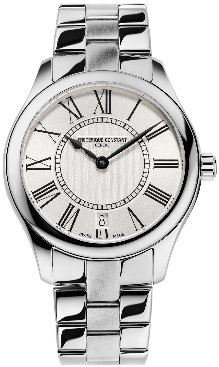 Frederique Constant Classics Ladies Quartz FC-220MS3B6B to damski zegarek na baterię na stalowej bransolecie w połączeniu kroju i połysku z zapięciem motylkowym. Koperta ze stali nierdzewnej ma średnicę 36 milimetrów i sygnowaną koronkę. Ten zegarek o klasycznym wyglądzie jest odpowiednim wyborem do noszenia na co dzień. Srebrna tarcza ze wskazaniem daty i środkiem ozdobionym giloszem jest chroniona wytrzymałym szkłem szafirowym. Czarne znaczniki godzin w kształcie cyfr rzymskich uzupełniają eleganckie wskazówki pik w identycznym kolorze. Zegarek napędza niezawodny mechanizm kwarcowy FC-220 (bazujący na mechanizmie Ronda 515). Wodoodporność zegarka wynosi 5 ATM, dzięki któremu jest odporny na zachlapania i zachlapania i opady.