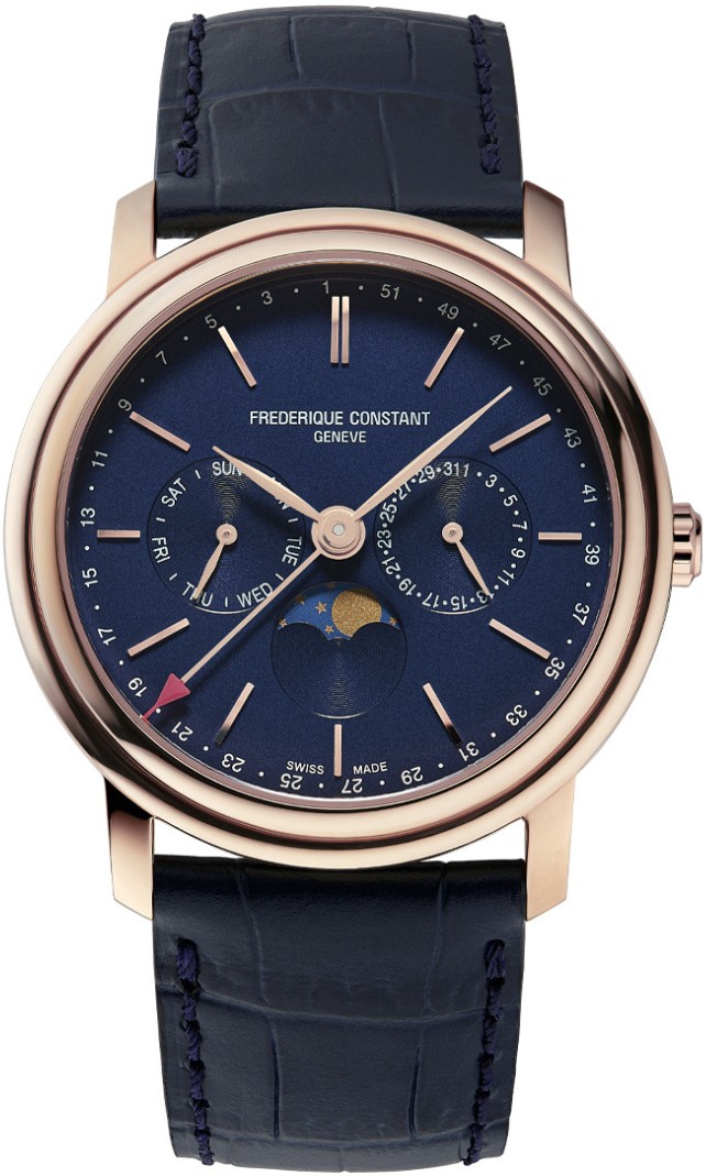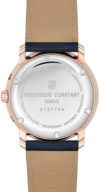Frederique Constant Classics Index Business Timer FC-270N4P4 to męski zegarek na baterię na niebieskim skórzanym pasku ze sprzączką. Koperta ze stali nierdzewnej PVD w kolorze różowego złota ma średnicę 40 milimetrów i sygnowaną koronkę. Ten elegancki zegarek jest odpowiednim wyborem do noszenia na co dzień. Niebieska tarcza ze wskaźnikami daty, dnia tygodnia i fazy księżyca jest chroniona wytrzymałym szkłem szafirowym. Dodatkowo tarcza posiada wskazówkę z charakterystyczną końcówką w kolorze czerwonym wskazującą tydzień po obwodzie tarczy. Zegarek napędza niezawodny mechanizm kwarcowy FC-270 (podstawą jest mechanizm Ronda 706.B podczas zachlapaniau i podczas prysznica.