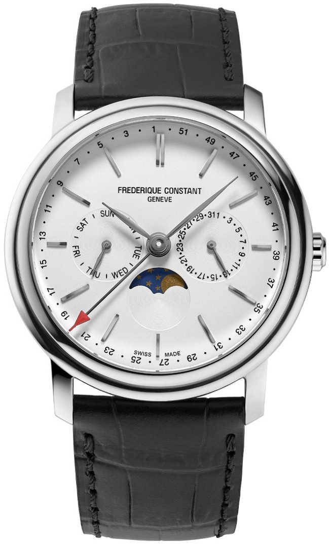 Frederique Constant Classics Index Business Timer FC-270SW4P26 to męski zegarek na baterię na czarnym skórzanym pasku ze sprzączką. Koperta ze stali nierdzewnej ma średnicę 40 milimetrów i sygnowaną koronkę. Ten elegancki zegarek jest odpowiednim wyborem do noszenia na co dzień. Biała tarcza z datą, dniem tygodnia i wskaźnikami faz księżyca jest chroniona wytrzymałym szkłem szafirowym. Dodatkowo tarcza posiada wskazówkę z charakterystyczną końcówką w kolorze czerwonym wskazującą tydzień po obwodzie tarczy. Zegarek napędza niezawodny mechanizm kwarcowy FC-270 (podstawą jest mechanizm Ronda 706.B podczas zachlapaniau i podczas prysznica.