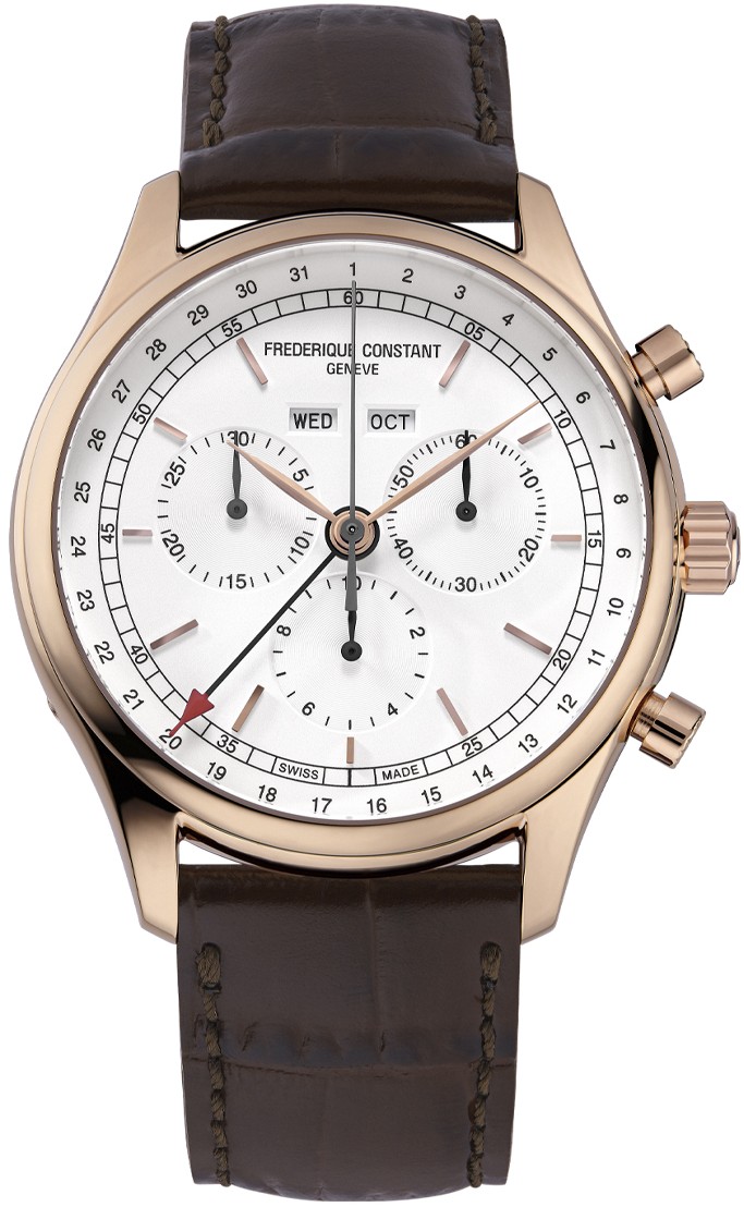 Frederique Constant Classics Quartz Chronograph Triple Calendar FC-296SW5B4 to męski zegarek na baterię na brązowym skórzanym pasku ze sprzączką. Koperta ze stali nierdzewnej PVD w kolorze różowego złota ma średnicę 40 milimetrów i sygnowaną koronkę. Ten sportowy, elegancki zegarek jest odpowiednim wyborem do noszenia na co dzień. Biała tarcza ze wskazaniem dnia tygodnia i miesiąca na godzinie 12 jest chroniona wytrzymałym szkłem szafirowym. Co więcej, tarcza posiada pomocnicze tarcze chronografu oraz datownik na obwodzie w postaci wskazówki z charakterystyczną czerwoną końcówką. Zegarek napędza niezawodny mechanizm kwarcowy FC-296 (podstawą jest mechanizm Ronda 5040.F). Dzięki wodoodporności 5 ATM zegarek jest odporny na zachlapania i zachlapania i opady.