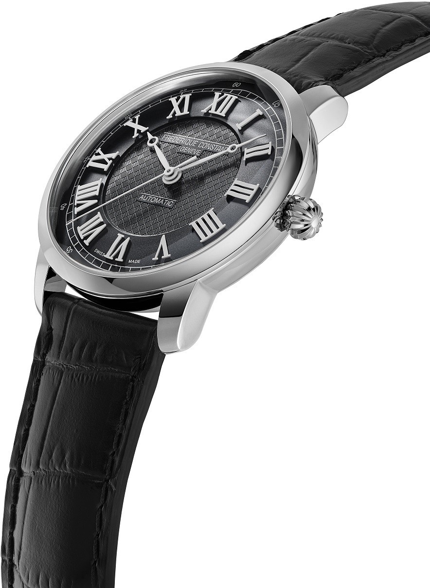 Frederique Constant Classics Premiere Limited Edition FC-301DGR3B6 to męski automatyczny zegarek na czarnym skórzanym pasku zapinanym na sprzączkę. Jest to limitowana edycja 500 sztuk na całym świecie. Koperta ze stali nierdzewnej ma średnicę 38,5 milimetra, przezroczysty dekiel i ozdobną koronę. Ten elegancki zegarek jest odpowiednim wyborem do noszenia na co dzień. Czarna tarcza ze szlifem słonecznym i środkiem ozdobionym giloszem jest chroniona wytrzymałym szkłem szafirowym. Zastosowane indeksy godzin w kształcie cyfr rzymskich uzupełniają eleganckie wskazówki breguet w kolorze białym. Zegarek napędzany jest mechanizmem FC-301 z naciągiem automatycznym i rezerwą chodu wynoszącą około 68 godzin. Kaliber bazuje na La Joux-Perret LJPG100. Ten mechanizm z funkcją hakowania można w razie potrzeby nakręcić ręcznie za pomocą koronki. Wodoodporność zegarka wynosi 5 ATM, dzięki któremu jest odporny na zachlapania i prysznic.