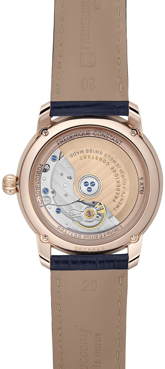 Frederique Constant Classics Premiere Limited Edition FC-301PVD3BD4 to automatyczny zegarek na niebieskim skórzanym pasku ze składanym zapięciem. Jest to limitowana edycja 100 sztuk na całym świecie. Koperta ze stali nierdzewnej w kolorze różowego złota PVD z ramką wysadzaną 70 diamentami o masie 0,41 ct ma średnicę 38,5 milimetra, przezroczysty dekiel i ozdobną koronę. Biała tarcza ze środkiem w kolorze różowego złota ozdobiona 289 diamentami o masie 0,45 ct jest chroniona wytrzymałym szkłem szafirowym. Zastosowane indeksy godzin w kształcie cyfr rzymskich uzupełniają eleganckie niebieskie wskazówki breguet. Zegarek napędzany jest mechanizmem FC-301 z naciągiem automatycznym i rezerwą chodu wynoszącą około 68 godzin. Kaliber bazuje na La Joux-Perret LJPG100. Ten mechanizm z funkcją hakowania można w razie potrzeby nakręcić ręcznie za pomocą koronki. Dzięki wodoodporności 5 ATM zegarek jest odporny na zachlapania i zachlapania i opady.