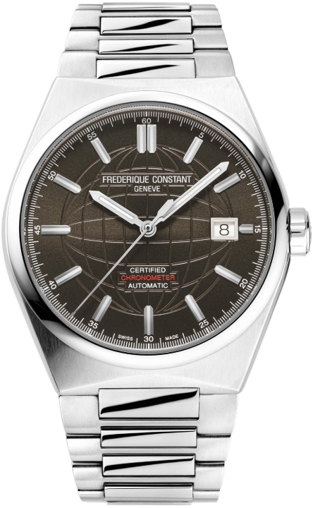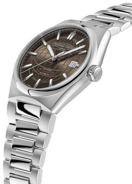 Frederique Constant Highlife Automatic COSC FC-303C3NH6B to męski zegarek automatyczny na zintegrowanej stalowej bransolecie w połączeniu kroju i połysku z zapięciem motylkowym. Koperta ze stali nierdzewnej ma średnicę 39 milimetrów, sygnowaną koronkę i przezroczysty dekiel. Ten uniwersalny zegarek w klasycznym stylu możesz nosić na co dzień. Brązową tarczę z motywem kuli ziemskiej i datownikiem chroni trwałe szkło szafirowe z powłoką antyrefleksyjną. Zastosowane indeksy godzinowe wraz ze wskazówkami pokryte są powłoką luminescencyjną Super-LumiNova®, która gwarantuje doskonałą czytelność w warunkach słabego oświetlenia. Zegarek napędzany jest mechanizmem FC-303 z naciągiem automatycznym i rezerwą chodu wynoszącą około 38 godzin. Podstawą kalibru jest Sellita SW200. Ten mechanizm z funkcją hakowania można w razie potrzeby nakręcić ręcznie za pomocą koronki. Zegarki posiadające certyfikat COSC, będący gwarancją dużej dokładności, noszą oznaczenie „Chronometr”. Dzięki wodoodporności 5 ATM są odporne na zachlapania i prysznic. W zestawie zapasowy gumowy pasek.