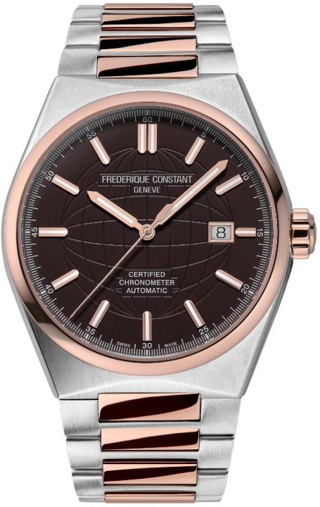 Frederique Constant Highlife Automatic COSC FC-303C4NH2B to męski zegarek automatyczny na zintegrowanej stalowej dwukolorowej bransolecie z częściową obróbką PVD w kolorze różowego złota i zapięciem motylkowym. Koperta ze stali nierdzewnej ma średnicę 41 milimetrów, przezroczysty dekiel oraz zewnętrzną bezel i koronkę pokryte metodą PVD w kolorze różowego złota. Ten uniwersalny zegarek w klasycznym stylu możesz nosić na co dzień. Brązową tarczę z motywem kuli ziemskiej i datownikiem chroni trwałe szkło szafirowe z powłoką antyrefleksyjną. Zastosowane indeksy godzinowe wraz ze wskazówkami pokryte są powłoką luminescencyjną Super-LumiNova®, która gwarantuje doskonałą czytelność w warunkach słabego oświetlenia. Zegarek napędzany jest mechanizmem FC-303 z naciągiem automatycznym i rezerwą chodu wynoszącą około 38 godzin. Podstawą kalibru jest Sellita SW200. Ten mechanizm z funkcją hakowania można w razie potrzeby nakręcić ręcznie za pomocą koronki. Zegarki posiadające certyfikat COSC, będący gwarancją dużej dokładności, noszą oznaczenie „Chronometr”. Dzięki wodoodporności 5 ATM są odporne na zachlapania i prysznic. W zestawie zapasowy gumowy pasek.