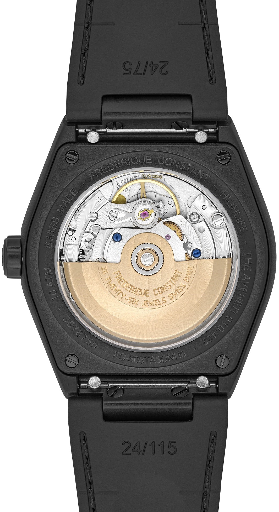 Frederique Constant Highlife Automatic x Avener Limited Edition FC-303TA3DNH6 to męski zegarek automatyczny na zintegrowanym czarnym gumowym pasku ze sprzączką. To limitowana edycja 432 sztuk na cały świat, która powstała we współpracy z francuskim muzykiem i DJ-em The Avener. Koperta ze stali nierdzewnej z czarną powłoką DLC ma średnicę 39 milimetrów, sygnowaną koronkę i przezroczysty dekiel. Czarną tarczę z motywem fali dźwiękowej chroni trwałe szkło szafirowe z powłoką antyrefleksyjną. Zastosowane indeksy godzinowe wraz ze wskazówkami pokryte są powłoką luminescencyjną Super-LumiNova®, która gwarantuje doskonałą czytelność w warunkach słabego oświetlenia. Zegarek napędzany jest mechanizmem FC-303 z naciągiem automatycznym i rezerwą chodu wynoszącą około 38 godzin. Podstawą kalibru jest Sellita SW200. Mechanizm ten z funkcją hakowania można w razie potrzeby nakręcić również ręcznie za pomocą koronki. Zegarek posiada funkcję datownika, a dzięki wodoodporności 10 ATM nadaje się do pływania i snorkelingu. W zestawie zapasowy czarny skórzany pasek.