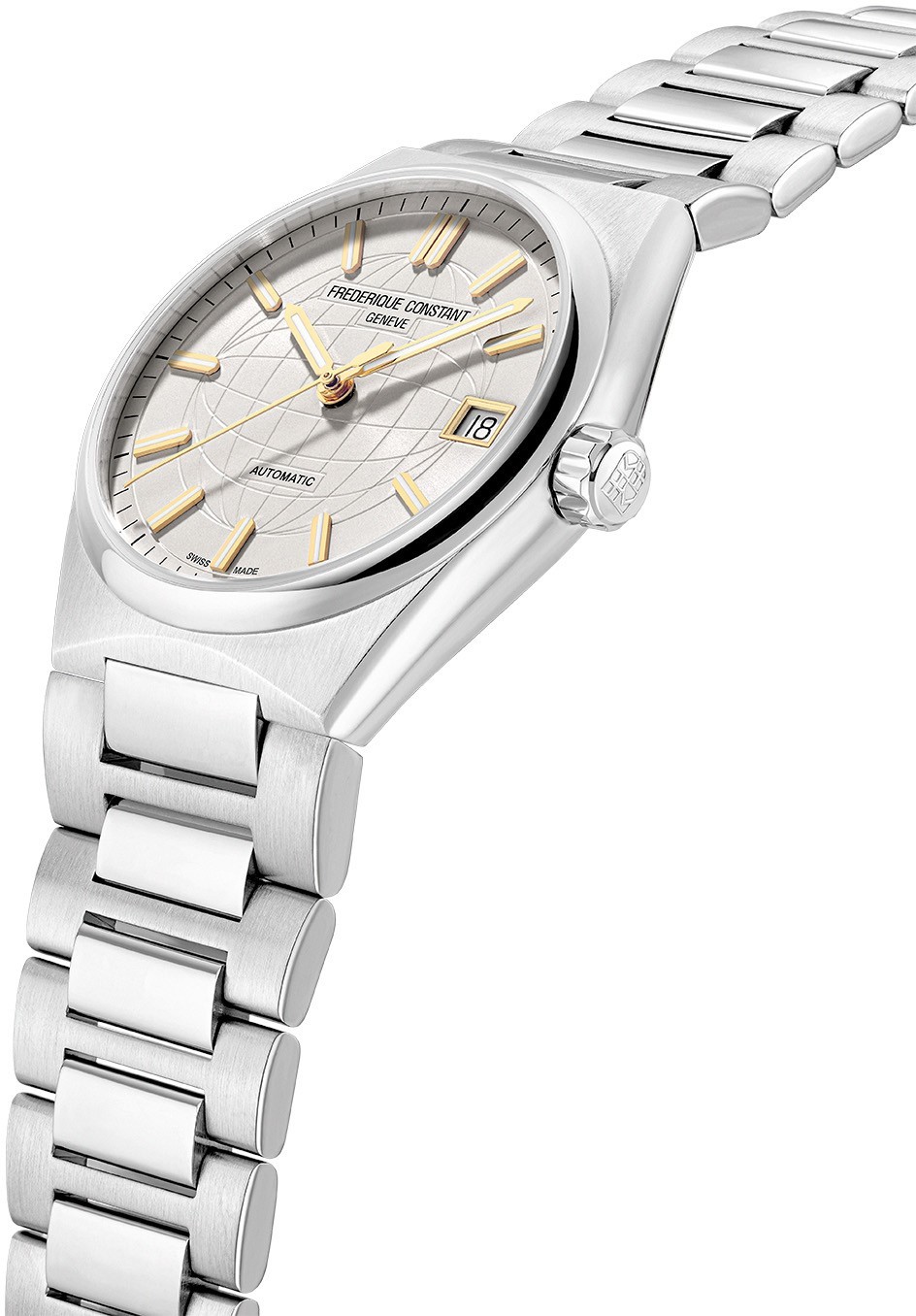 Frederique Constant Highlife Ladies Automatic FC-303WG2NH6B to damski zegarek automatyczny na zintegrowanej stalowej bransolecie w połączeniu kroju i połysku z zapięciem motylkowym. Koperta ze stali nierdzewnej ma średnicę 34 milimetrów, sygnowaną koronkę i przezroczysty dekiel. Ten uniwersalny zegarek w klasycznym stylu możesz nosić na co dzień. Biała tarcza z motywem kuli ziemskiej jest chroniona wytrzymałym szkłem szafirowym. Nanoszone indeksy godzin wraz ze wskazówkami pokryte są powłoką luminescencyjną Super-LumiNova®, która gwarantuje doskonałą czytelność w warunkach słabego oświetlenia. Zegarek napędzany jest mechanizmem FC-303 z naciągiem automatycznym i rezerwą chodu wynoszącą około 38 godzin. Podstawą kalibru jest Sellita SW200. Mechanizm ten z funkcją hakowania można w razie potrzeby nakręcić również ręcznie za pomocą koronki. Zegarek posiada funkcję datownika, a dzięki wodoodporności 5 ATM jest odporny na zachlapania i zachlapania i opady. W zestawie zapasowy gumowy pasek.