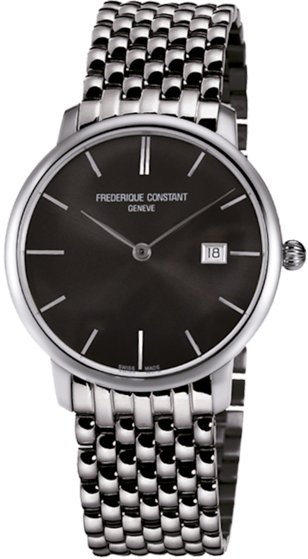 Frederique Constant Slimline FC-306G4S6B to męski zegarek automatyczny na stalowej bransolecie z zapięciem motylkowym. Koperta ze stali nierdzewnej ma średnicę 40 milimetrów, wygodną grubość 9,2 milimetra, przezroczysty dekiel i ozdobną koronę. Ten uniwersalny zegarek o klasycznym wyglądzie jest odpowiednim wyborem do noszenia na co dzień. Czarną tarczę z datownikiem chroni trwałe szkło szafirowe. Zastosowane indeksy godzin uzupełniają eleganckie wskazówki w postaci liści. Zegarek napędzany jest mechanizmem FC-306 z naciągiem automatycznym i rezerwą chodu wynoszącą około 42 godziny. Podstawą kalibru jest Sellita SW300. Ten mechanizm z funkcją hakowania można w razie potrzeby nakręcić ręcznie za pomocą koronki. Dzięki wodoodporności 3 ATM zegarek jest odporny na wilgoć i zachlapania.