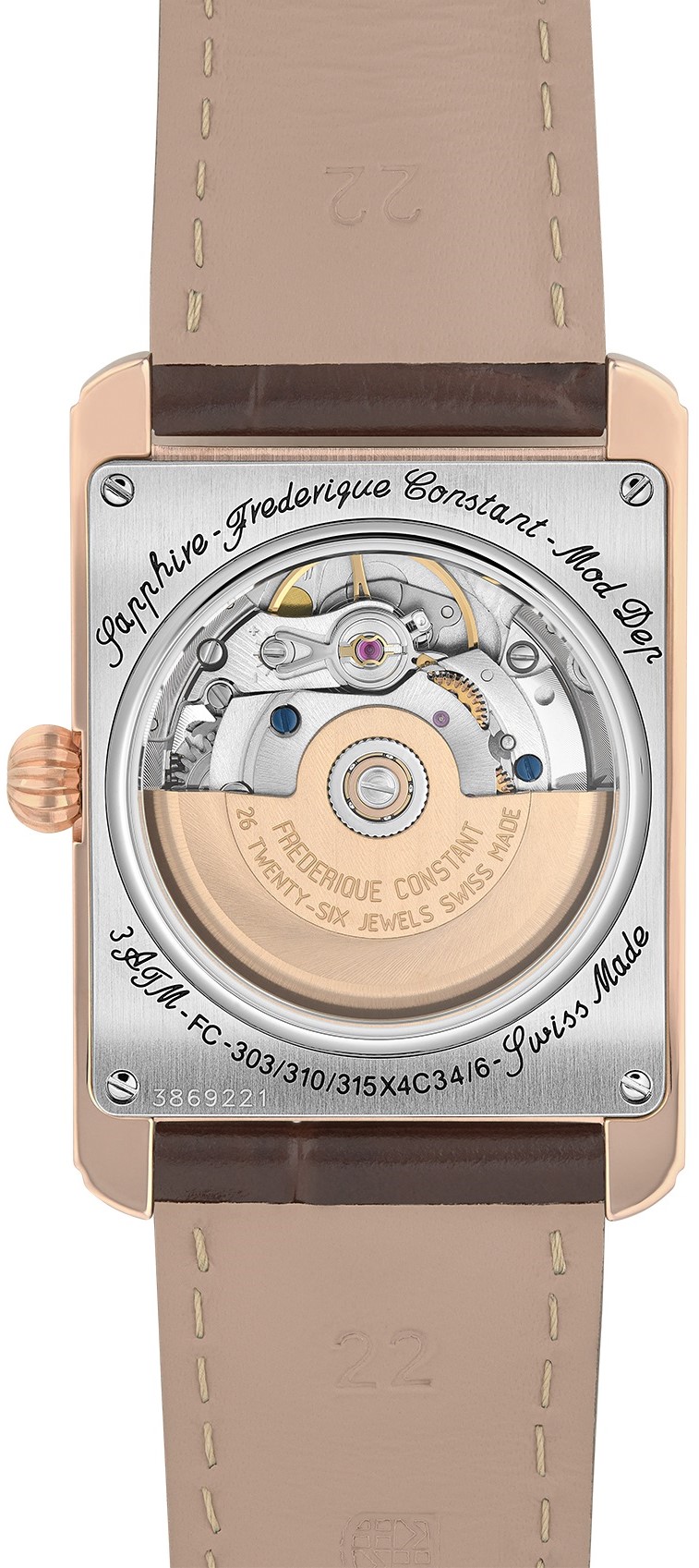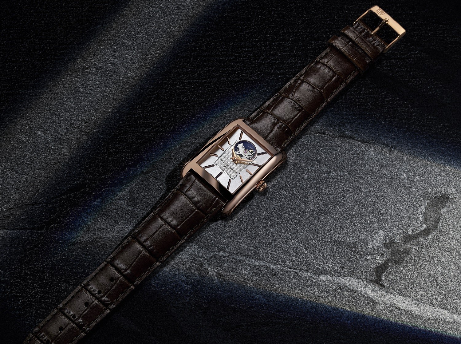 Frederique Constant Classics Carrée Heart Beat Automatic FC-311S4C4 to męski zegarek automatyczny na brązowym skórzanym pasku zapinanym na sprzączkę. Kwadratowa koperta ze stali nierdzewnej z wykończeniem PVD w kolorze różowego złota ma wymiary 30,4 x 33,3 milimetrów, ma przezroczysty dekiel i dekorowaną koronę. Ten elegancki zegarek możesz nosić na co dzień. Srebrna tarcza ze szlifem słonecznym, widokiem na serce mechanizmu (koło zamachowe) i ozdobionym giloszem środkiem, jest chroniona wytrzymałym szkłem szafirowym. Zastosowane indeksy godzin uzupełniają eleganckie wskazówki typu dauphine. Zegarek napędzany jest mechanizmem FC-311 z naciągiem automatycznym i rezerwą chodu wynoszącą około 38 godzin. Podstawą kalibru jest Sellita SW200. Ten mechanizm z funkcją hakowania można w razie potrzeby nakręcić ręcznie za pomocą koronki. Dzięki wodoodporności 3 ATM zegarek jest odporny na wilgoć i zachlapania.