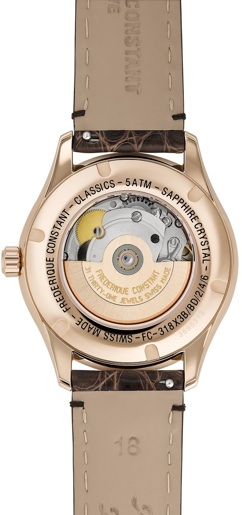 Frederique Constant Ladies Automatic Small Seconds FC-318MPC3B4 to damski zegarek automatyczny na brązowym skórzanym pasku ze składanym zapięciem. Koperta ze stali nierdzewnej z powłoką PVD w kolorze różowego złota ma średnicę 36 milimetrów, przezroczysty dekiel i sygnowaną koronkę. Ten wszechstronny, elegancki zegarek jest odpowiednim wyborem do noszenia na co dzień. Brązowa tarcza ze wskazaniem daty i środkiem ozdobionym giloszem jest chroniona trwałymszkłem szafirowym. Złote indeksy godzin z cyframi rzymskimi wyróżniają się na brązowym obwodzie tarczy z masy perłowej i są uzupełnione eleganckimi wskazówkami łopatkowymi i wskazówką sekundową znajdującą się na godzinie dziewiątej. Zegarek napędzany jest mechanizmem FC-318 z naciągiem automatycznym i rezerwą chodu wynoszącą około 38 godzin. Bazą tego kalibru jest Sellita SW290. Ten mechanizm z funkcją hakowania można w razie potrzeby nakręcić ręcznie za pomocą koronki. Dzięki wodoodporności 5 ATM zegarek jest odporny na zachlapania i zachlapania i opady.