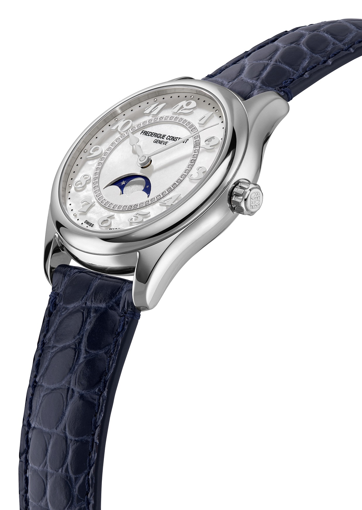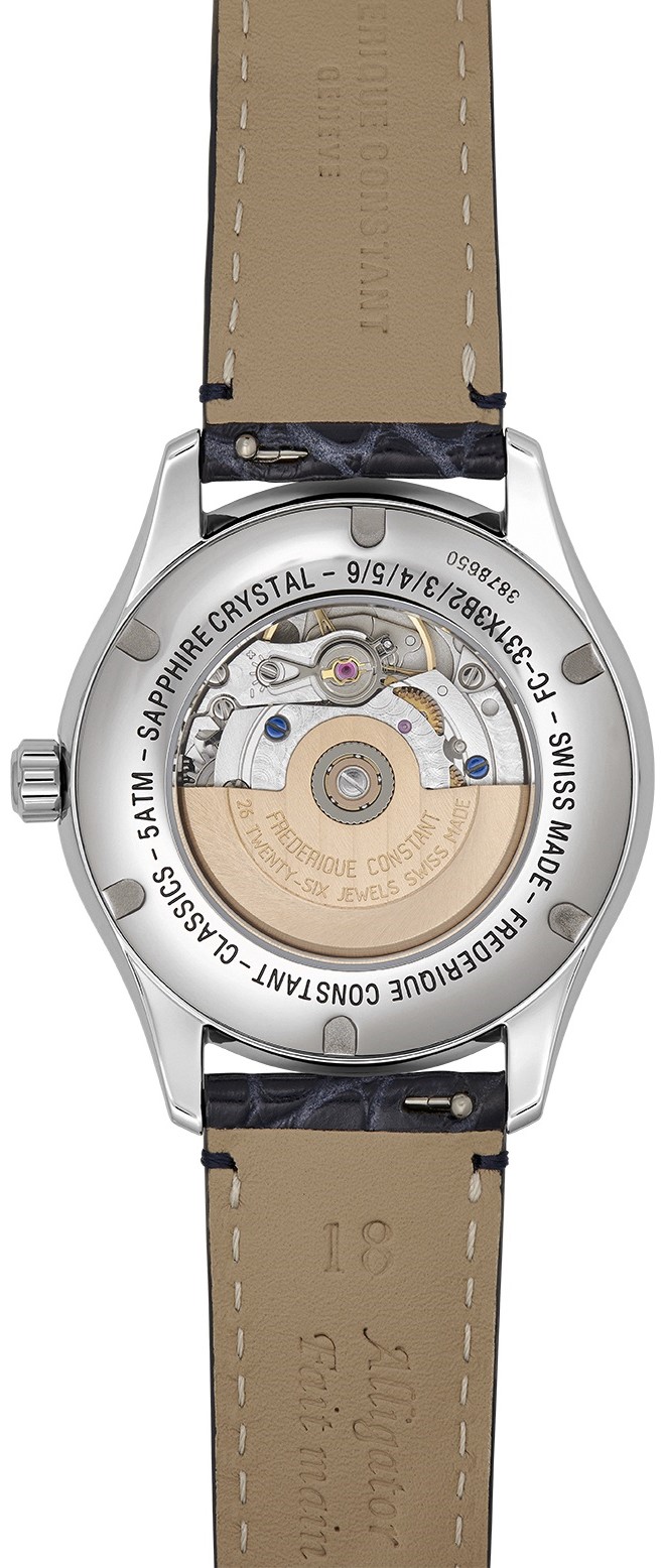 Frederique Constant Classics Elegance FC-331MPWD3B6 to damski zegarek automatyczny na niebieskim pasku ze skóry aligatora ze składanym zapięciem. Koperta ze stali nierdzewnej ma średnicę 36 milimetrów, przezroczysty dekiel i sygnowaną koronkę. Ten elegancki zegarek jest odpowiednim wyborem do noszenia na co dzień. Tarcza z masy perłowej ze wskaźnikiem faz księżyca i 56 diamentów o masie 0,7 ct jest chroniona wytrzymałym szkłem szafirowym, a jej piękno uwydatnia się szczególnie w bezpośrednim świetle, gdzie możemy przyjrzyj się grze kolorów masy perłowej. Zastosowane indeksy godzin uzupełniają eleganckie wskazówki w postaci liści. Zegarek napędzany jest mechanizmem FC-331 z naciągiem automatycznym i rezerwą chodu wynoszącą około 38 godzin. Podstawą kalibru jest Sellita SW280. Ten mechanizm z funkcją hakowania można w razie potrzeby nakręcić ręcznie za pomocą koronki. Dzięki wodoodporności 5 ATM zegarek jest odporny na zachlapania i zachlapania i opady.