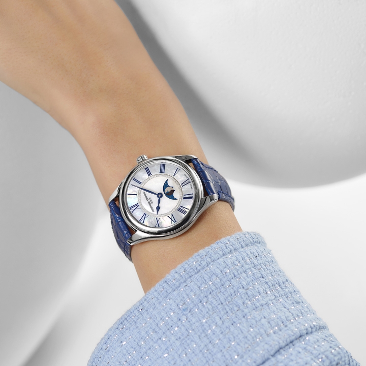 Frederique Constant Classics Elegance Luna FC-331MPWND3B6 to damski zegarek automatyczny na niebieskim skórzanym pasku ze składanym zapięciem. Koperta ze stali nierdzewnej ma średnicę 36 milimetrów, przezroczysty dekiel i sygnowaną koronkę. Ten elegancki zegarek jest odpowiednim wyborem do noszenia na co dzień. Tarcza z masy perłowej ze wskaźnikiem faz księżyca i 56 diamentów o masie 0,7 ct chroniona jest wytrzymałym szkłem szafirowym z powłoką antyrefleksyjną, a jej piękno wyróżnia się szczególnie pod bezpośrednie światło, kiedy możemy obserwować grę perłowych kolorów. Zastosowane indeksy godzin w postaci cyfr rzymskich uzupełniają eleganckie wskazówki w postaci liści. Zegarek napędzany jest mechanizmem FC-331 z naciągiem automatycznym i rezerwą chodu wynoszącą około 38 godzin. Podstawą kalibru jest Sellita SW280. Ten mechanizm z funkcją hakowania można w razie potrzeby nakręcić ręcznie za pomocą koronki. Dzięki wodoodporności 5 ATM zegarek jest odporny na zachlapania i zachlapania i opady.