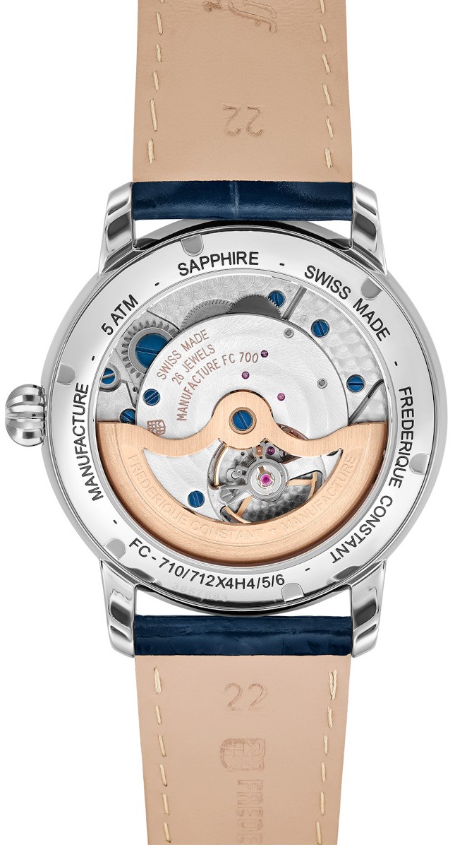 Frederique Constant Classics Moonphase Manufacture FC-712MN4H6 to męski automatyczny zegarek na niebieskim skórzanym pasku z białymi przeszyciami i składanym zapięciem. Koperta ze stali nierdzewnej ma średnicę 42 milimetrów, przezroczysty dekiel i ozdobną koronę. Ten elegancki zegarek jest odpowiednim wyborem do noszenia na co dzień. Ciemnoniebieska tarcza ze wskazaniem daty na tarczy pomocniczej na godzinie dziewiątej i wskaźnikiem fazy księżyca na godzinie trzeciej jest chroniona trwałym szkłem szafirowym. Białe indeksy godzin uzupełniają eleganckie wskazówki w kształcie liścia w identycznym kolorze. Zegarek napędza manufakturowy mechanizm FC-712 z naciągiem automatycznym i rezerwą chodu wynoszącą około 42 godziny. Ten mechanizm z funkcją hakowania można w razie potrzeby nakręcić ręcznie za pomocą koronki. Wodoodporność zegarka wynosi 5 ATM, dzięki któremu jest odporny na zachlapania i zachlapania i opady.