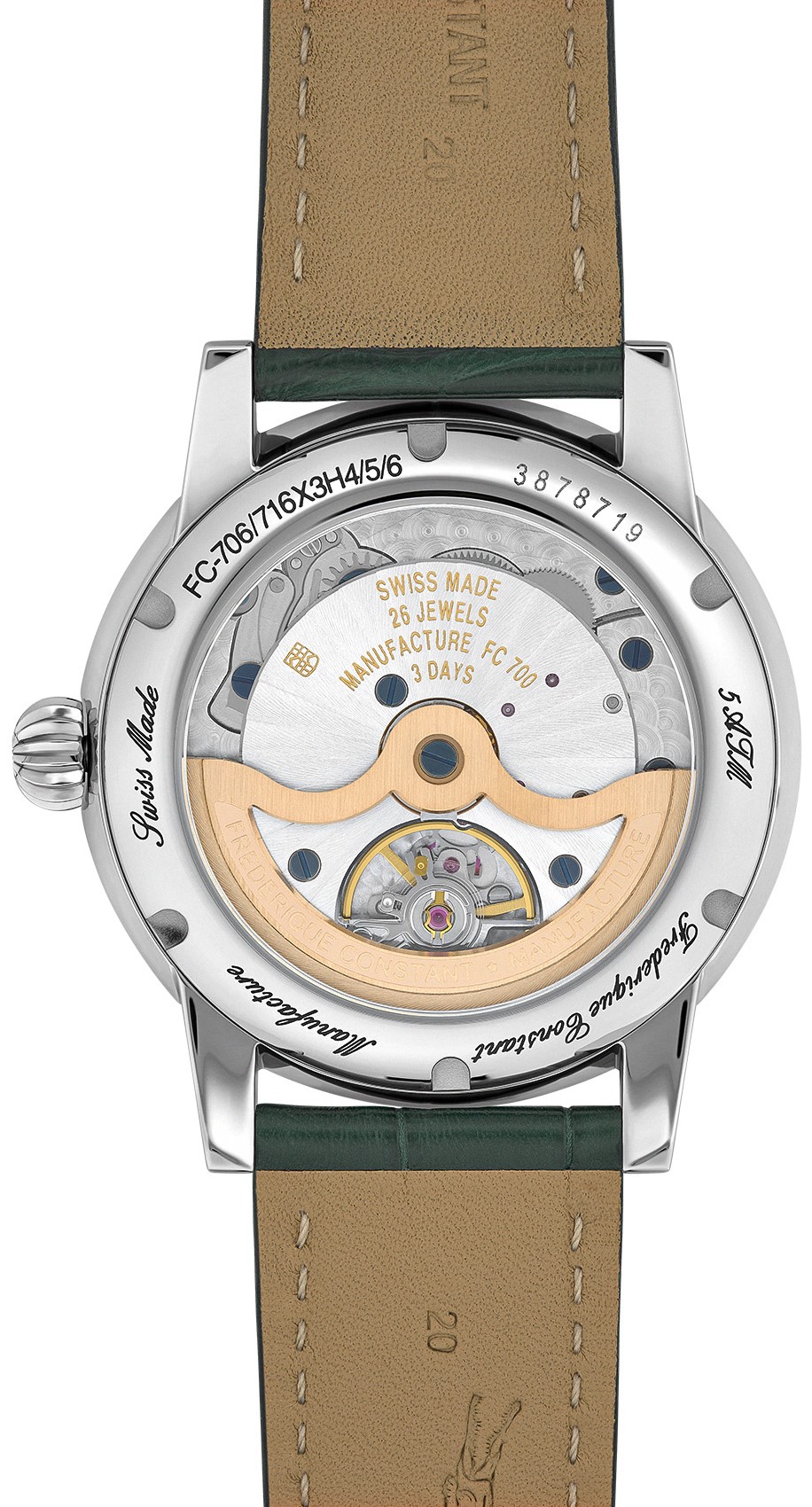Na deklu zegarka Classic Moonphase Date Manufacture również ucieleśnia całą dbałość i uwagę, jaką Frederique Constant poświęca wykończeniom. Przez przeszklony dekiel można podglądać na pracę nowego mechanizmu FC-716 z rubinami i wykończeniem Côtes de Genève. Mechanizm o wysokiej precyzji bije z częstotliwością 4 Hz i jest odporny na codzienne wyzwania i potrafi utrzymać dokładność chodu nawet w trudnych warunkach.