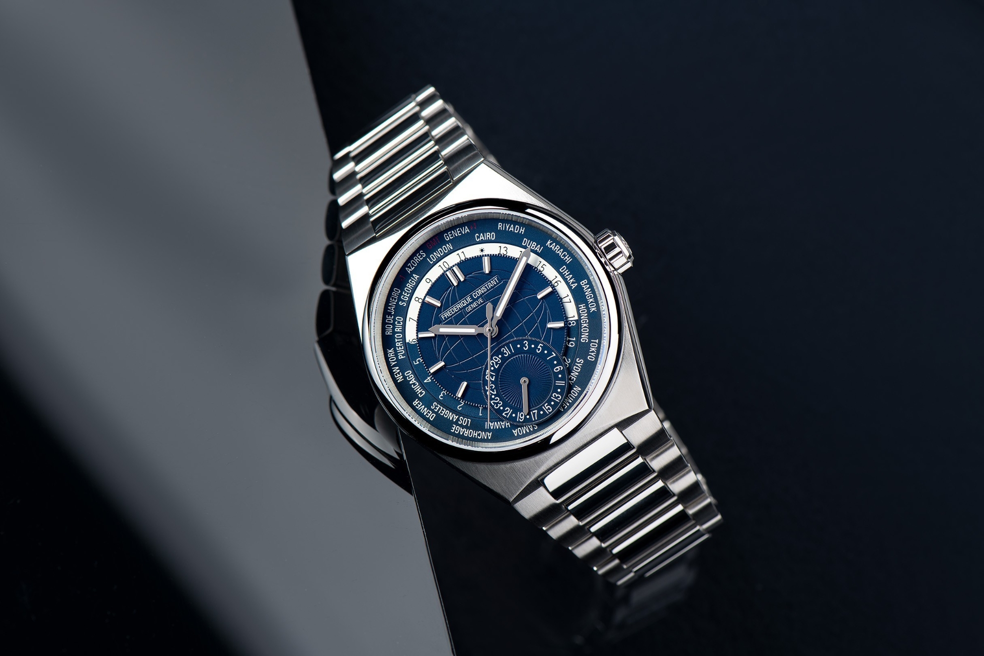 Frederique Constant Highlife Worldtimer Manufacture FC-718N4NH6B to męski automatyczny zegarek na stalowej bransolecie, będący połączeniem kroju i połysku z zapięciem motylkowym. Koperta ze stali nierdzewnej ma średnicę 41 milimetrów, przezroczysty dekiel i sygnowaną koronkę. Możesz używać tego zegarka o klasycznym wyglądzie do noszenia na co dzień, a zwłaszcza podczas podróży, dzięki funkcji wskaźnika czasu światowego, która umożliwia odczytywanie czasu w różnych strefach czasowych. Niebieska tarcza z motywem kuli ziemskiej, wskaźnikiem dnia/nocy i wskazówką daty jest chroniona wytrzymałym szkłem szafirowym z powłoką antyrefleksyjną. Zastosowane indeksy godzinowe wraz ze wskazówkami pokryte są powłoką luminescencyjną Super-LumiNova®, która gwarantuje doskonałą czytelność w warunkach słabego oświetlenia. Zegarek napędzany jest manufakturowym mechanizmem FC-718 z naciągiem automatycznym i rezerwą chodu wynoszącą około 38 godzin. Ten mechanizm z funkcją hakowania można w razie potrzeby nakręcić ręcznie za pomocą koronki. Dzięki wodoodporności 10 ATM nadają się do pływania i snorkelingu. W zestawie 2 zapasowe niebieskie paski - skórzane i gumowe.