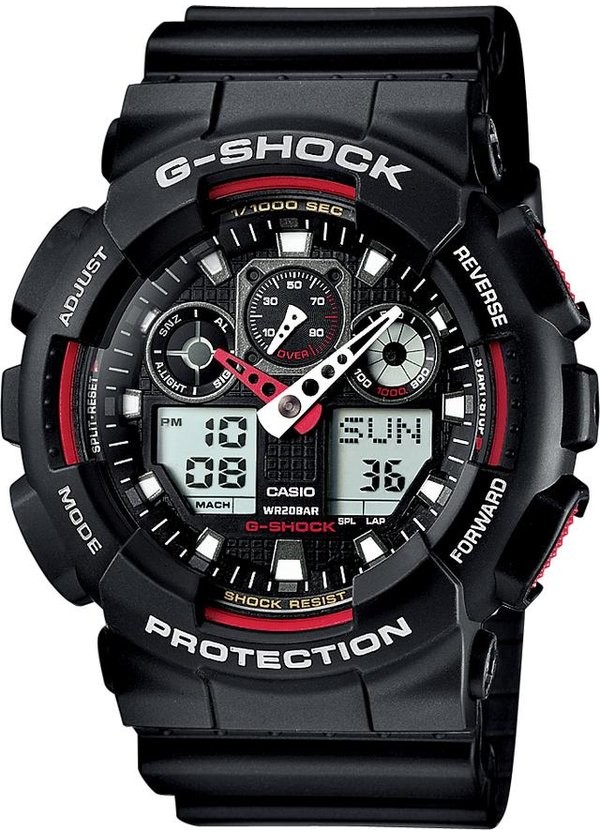 Jeden z najlepiej sprzedających się modeli Casio G-Shock GA-100 posiada typowo sportowy wygląd, o który dba nie tylko żywiczny pasek z zapięciem cierniowym, ale także masywna żywiczna koperta średnicę 51,2 milimetra , który jest odporny na wstrząsy i magnetyzm. Wodoszczelność zegarka wynosi 200 metrów.