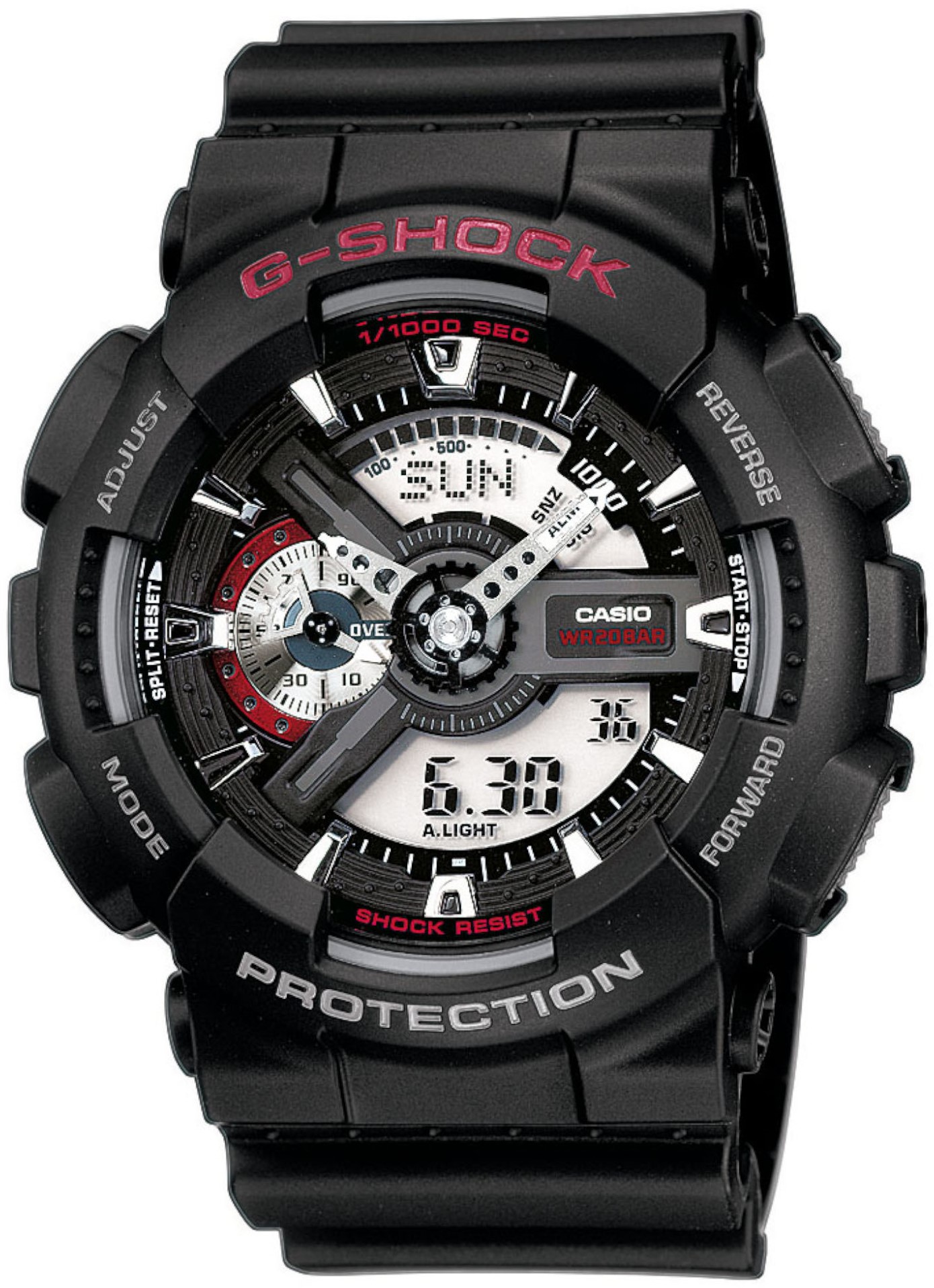 Jeden z najlepiej sprzedających się modeli Casio G-Shock GA-110 posiada typowo sportowy wygląd, o który dba nie tylko żywiczny pasek z zapięciem cierniowym, ale także masywna żywiczna koperta średnicę 51,2 milimetra , który jest odporny na wstrząsy i magnetyzm. Wodoszczelność zegarka wynosi 200 metrów.