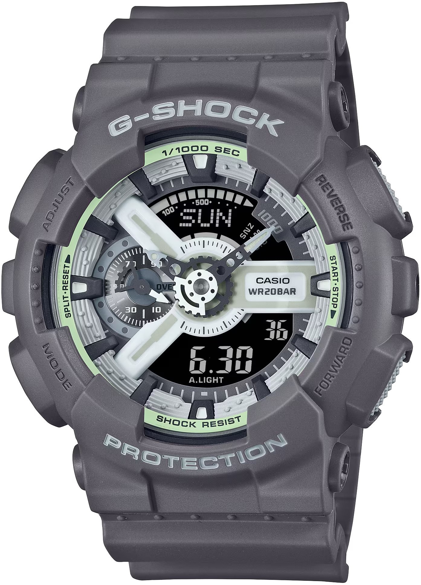 Jeden z najlepiej sprzedających się modeli Casio G-Shock, GA-110, posiada typowo sportowy wygląd, o który dba nie tylko żywiczny pasek z zapięciem cierniowym, ale także masywna żywiczna obudowa średnicę 51,2 milimetra, który jest odporny na wstrząsy i magnetyzm. Wodoodporność zegarka sięga 200 metrów, dzięki któremu pozwala użytkownikom nurkować na głębokie głębokości.