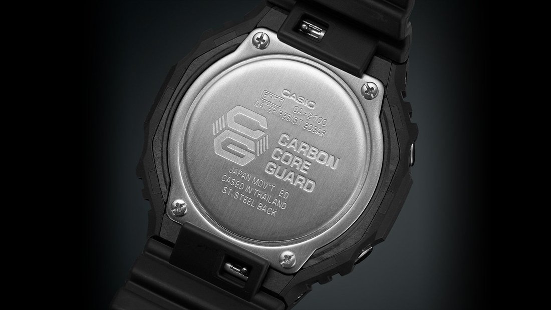 Seria G-Shock GA-2100 reprezentuje najcieńszy zegarek obecnych modeli G-Shock, a jego obudowa średnicę 45,4 milimetra wykonana z żywicy ma wysokość zaledwie 11,8 milimetry< /strong>. Etui posiada nową koncepcję ramki oryginalnego modelu G-Shock DW-5000C z 1983 roku, nawiązującą do tej serii. Oprócz nowego designu, seria ta różni się od modelu DW-5000C nową konstrukcją Carbon Core Guard, czyli wzmocnieniem koperty włóknami węglowymi, co zapewnia dużą wytrzymałość obudowy i przy tym niska waga zegarka – tylko 51 gramów. Tradycyjnie ukształtowany pasek z klamrą typu pin wykonany jest z żywicy o matowym wykończeniu. Zegarek zasilany jest baterią o żywotności do 3 lat i można z nim także nurkować, gdyż jego wodoodporność sięga 200 metrów.
