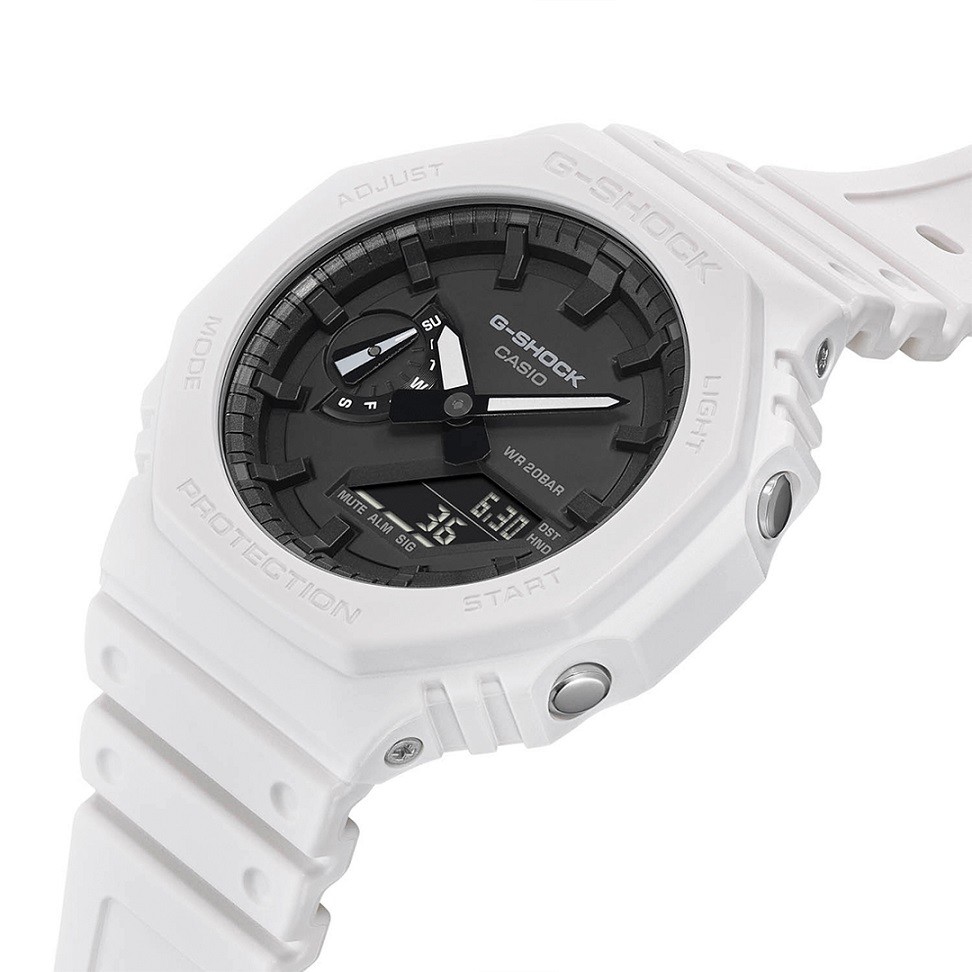 Seria G-Shock GA-2100 reprezentuje najcieńszy zegarek obecnych modeli G-Shock, a jego obudowa średnicę 45,4 milimetra wykonana z żywicy ma wysokość zaledwie 11,8 milimetry< /strong>. Etui posiada nową koncepcję ramki oryginalnego modelu G-Shock DW-5000C z 1983 roku, nawiązującą do tej serii. Oprócz nowego designu, seria ta różni się od modelu DW-5000C nową konstrukcją Carbon Core Guard, czyli wzmocnieniem koperty włóknami węglowymi, co zapewnia dużą wytrzymałość obudowy i przy tym niska waga zegarka – tylko 51 gramów. Tradycyjnie ukształtowany pasek z klamrą typu pin wykonany jest z żywicy o matowym wykończeniu. Zegarek zasilany jest baterią o żywotności do 3 lat i można z nim także nurkować, gdyż jego wodoodporność sięga 200 metrów.