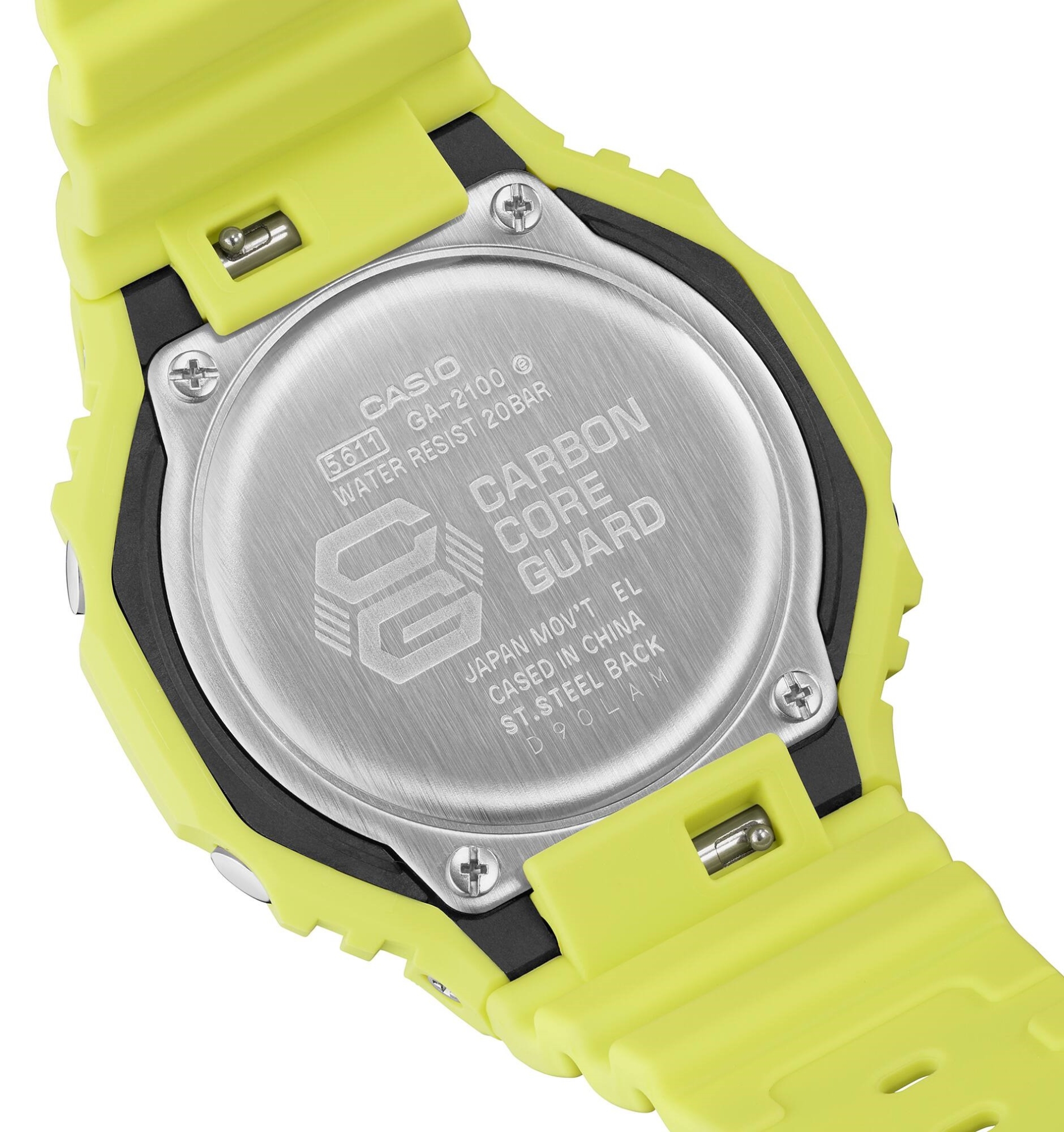Seria G-Shock GA-2100 reprezentuje najcieńszy zegarek obecnych modeli G-Shock, a jego obudowa średnicę 45,4 milimetra wykonana z żywicy ma wysokość zaledwie 11,8 milimetry< /strong>. Etui posiada nową koncepcję ramki oryginalnego modelu G-Shock DW-5000C z 1983 roku, nawiązującą do tej serii. Oprócz nowego designu, seria ta różni się od modelu DW-5000C nową konstrukcją Carbon Core Guard, czyli wzmocnieniem koperty włóknami węglowymi, co zapewnia dużą wytrzymałość obudowy i przy tym niska waga zegarka – tylko 51 gramów. Tradycyjnie ukształtowany pasek z klamrą typu pin wykonany jest z żywicy o matowym wykończeniu. Zegarek zasilany jest baterią o żywotności do 3 lat i można z nim także nurkować, gdyż jego wodoodporność sięga 200 metrów.