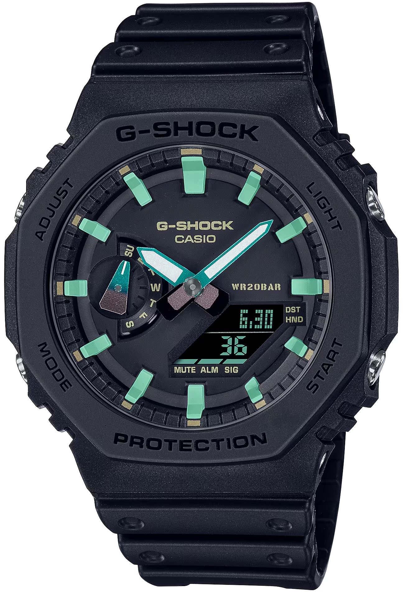 Seria G-Shock GA-2100 reprezentuje najcieńszy zegarek obecnych modeli G-Shock, a jego obudowa średnicę 45,4 milimetra wykonana z żywicy ma wysokość zaledwie 11,8 milimetry< /strong>. Etui posiada nową koncepcję ramki oryginalnego modelu G-Shock DW-5000C z 1983 roku, nawiązującą do tej serii. Oprócz nowego designu, seria ta różni się od modelu DW-5000C nową konstrukcją Carbon Core Guard, czyli wzmocnieniem koperty włóknami węglowymi, co zapewnia dużą wytrzymałość obudowy i przy tym niska waga zegarka – tylko 51 gramów. Tradycyjnie ukształtowany pasek z klamrą typu pin wykonany jest z żywicy o matowym wykończeniu. Zegarek zasilany jest baterią o żywotności do 3 lat i można z nim także nurkować, gdyż jego wodoodporność sięga 200 metrów.