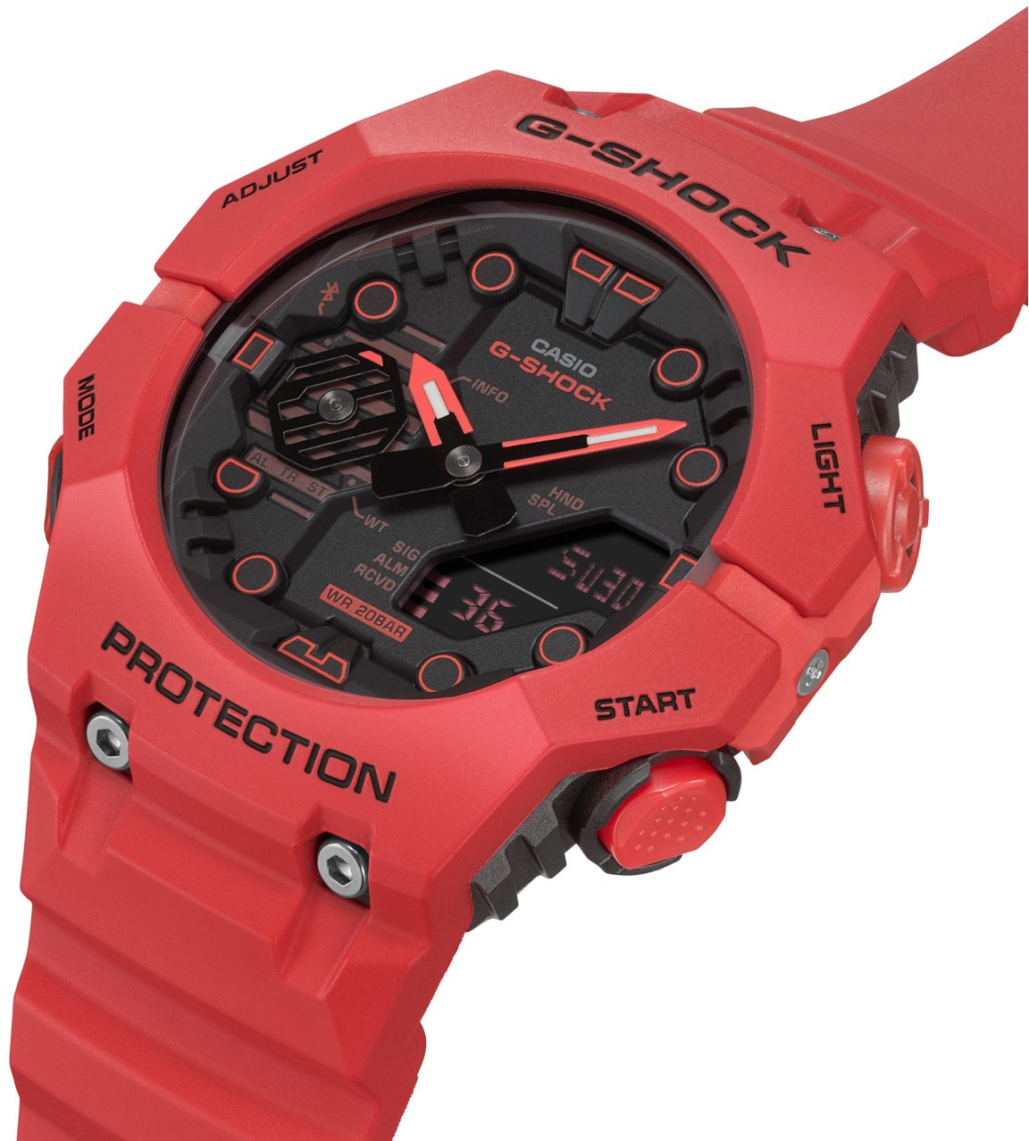 Nowa seria zegarków G-SHOCK GA-B001 o nowym designie skupionym na wytrzymałości i z funkcją Smartphone Link. Odważna kolorystyka przeniesie Cię nie tylko stylowymi ulicami miasta. Te zegarki to coś więcej niż tylko modny dodatek, zapewniają także doskonałą funkcjonalność. Zsynchronizuj je ze smartfonem przez Bluetooth® i połącz je ze specjalną aplikacją, która zapewni Ci dostęp do potrzebnych funkcji Seria GA-B001 charakteryzuje się innowacyjną konstrukcją z dwiema oddzielnymi górną i dolną częścią ramki, które łączą się na godzinie 9. i na godzinie trzeciej. Dopełnieniem tej pomysłowości jest dbałość o szczegóły. Indeksy i wyświetlacz LCD o unikalnym kształcie zostały zaprojektowane jak nigdy dotąd w zegarku G-SHOCK.
