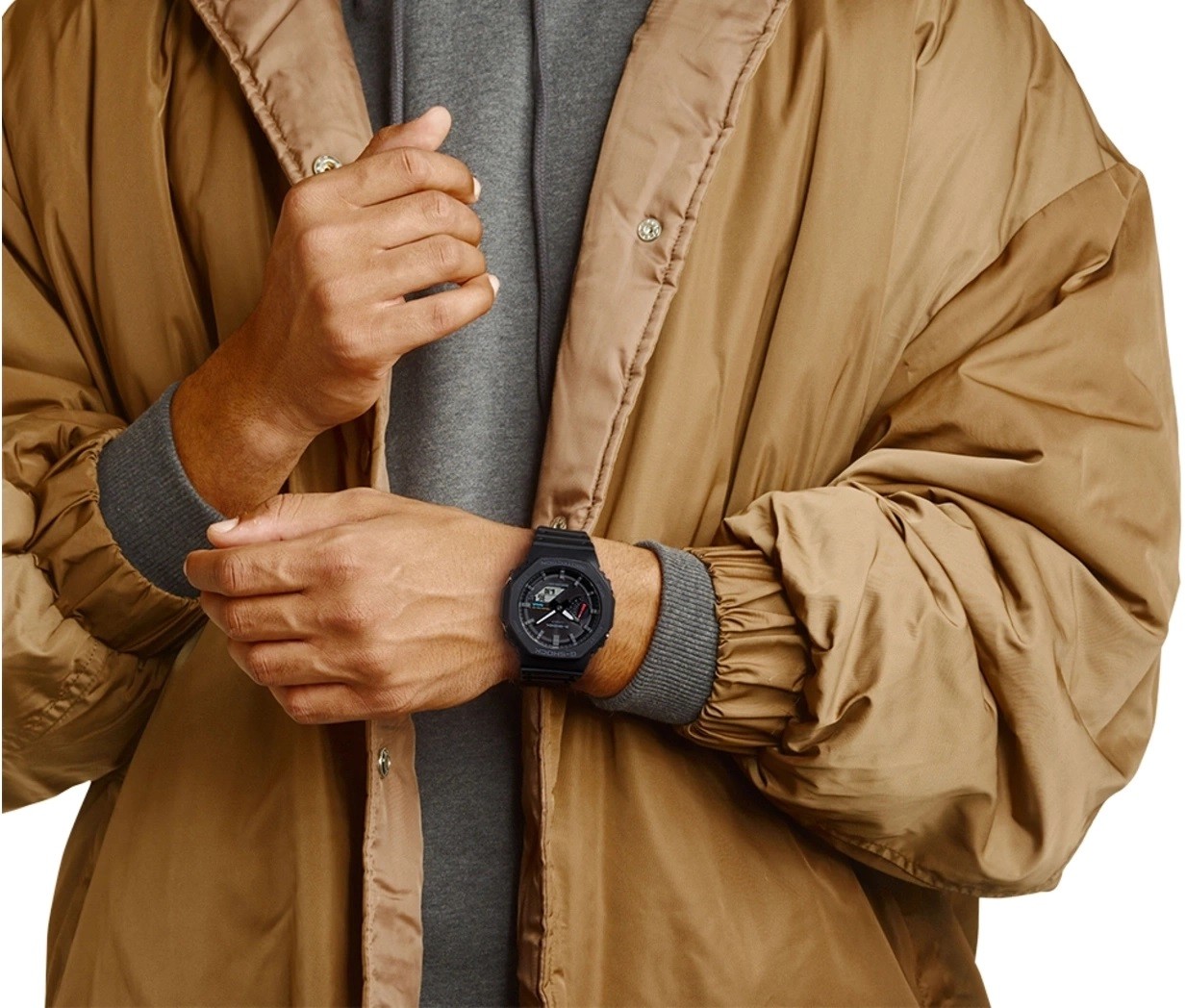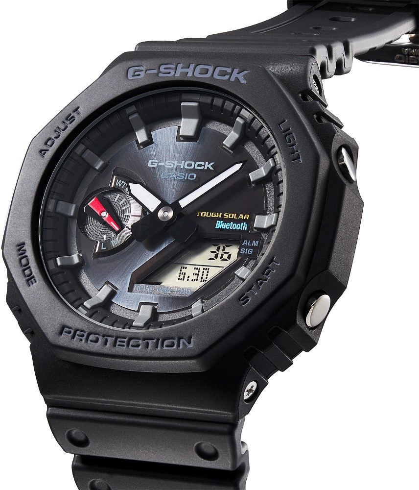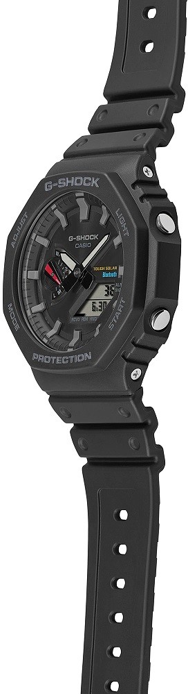 Seria G-Shock GA-B2100 reprezentuje najcieńszy zegarek obecnych modeli G-Shock, a jego obudowa średnicę 45,4 milimetra wykonana z żywicy ma wysokość zaledwie 11,9 milimetry< /strong>. Etui posiada nową koncepcję ramki oryginalnego modelu G-Shock DW-5000C z 1983 roku, nawiązującą do tej serii. Oprócz nowego designu, seria ta różni się od modelu DW-5000C nową konstrukcją Carbon Core Guard, czyli wzmocnieniem koperty włóknami węglowymi, co zapewnia dużą wytrzymałość obudowy i przy tym niska waga zegarka – tylko 52 gramy. Tradycyjnie ukształtowany pasek z klamrą typu pin wykonany jest z żywicy o matowym wykończeniu. Zegarek zasilany jest mechanizmem zasilanym energią słoneczną i można z nim także nurkować, ponieważ jego wodoodporność sięga 200 metrów. Można je także synchronizować ze smartfonem za pomocą Bluetooth.