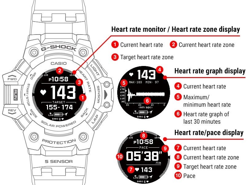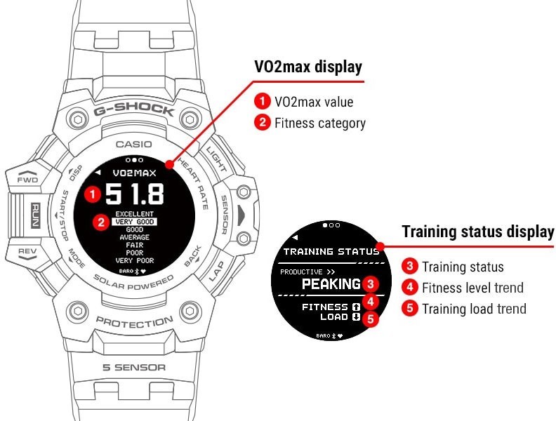 Zegarek sportowy G-Shock G-Squad umożliwia monitoruj swoje wyniki sportowe i jednocześnie przejmij kontrolę nad swoim zdrowiem. Mają 5 czujników, które mierzą aktywność w czasie rzeczywistym: