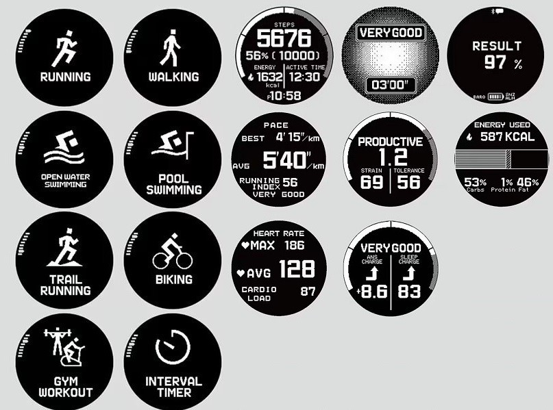 - Zegarek obsługuje osiem różnych aktywności. Naciśnij przycisk, aby wybrać aktywność, a następnie możesz monitorować różne pomiary w czasie rzeczywistym:
