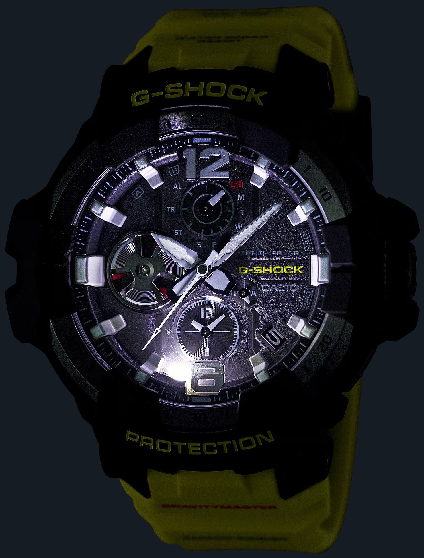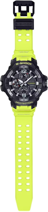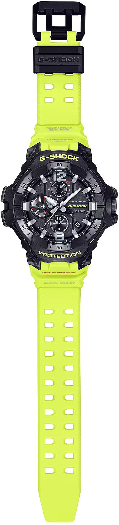 Casio G-Shock Gravitymaster GR-B300RY-1A9ER to męski, sportowy zegarek solarny na żółto-zielonym pasku z tworzywa sztucznego ze sprzączką. Koperta wykonana z żywicy epoksydowej i włókna węglowego ma średnicę 54,7 milimetrów i dekiel wykonany ze stali nierdzewnej. Czarną tarczę z podświetleniem LED chroni wytrzymałe szkło mineralne. Zegarek napędzany jest mechanizmem 5719 zasilanym energią słoneczną, który zapewnia dokładność pomiaru czasu ±15 sekund na miesiąc.