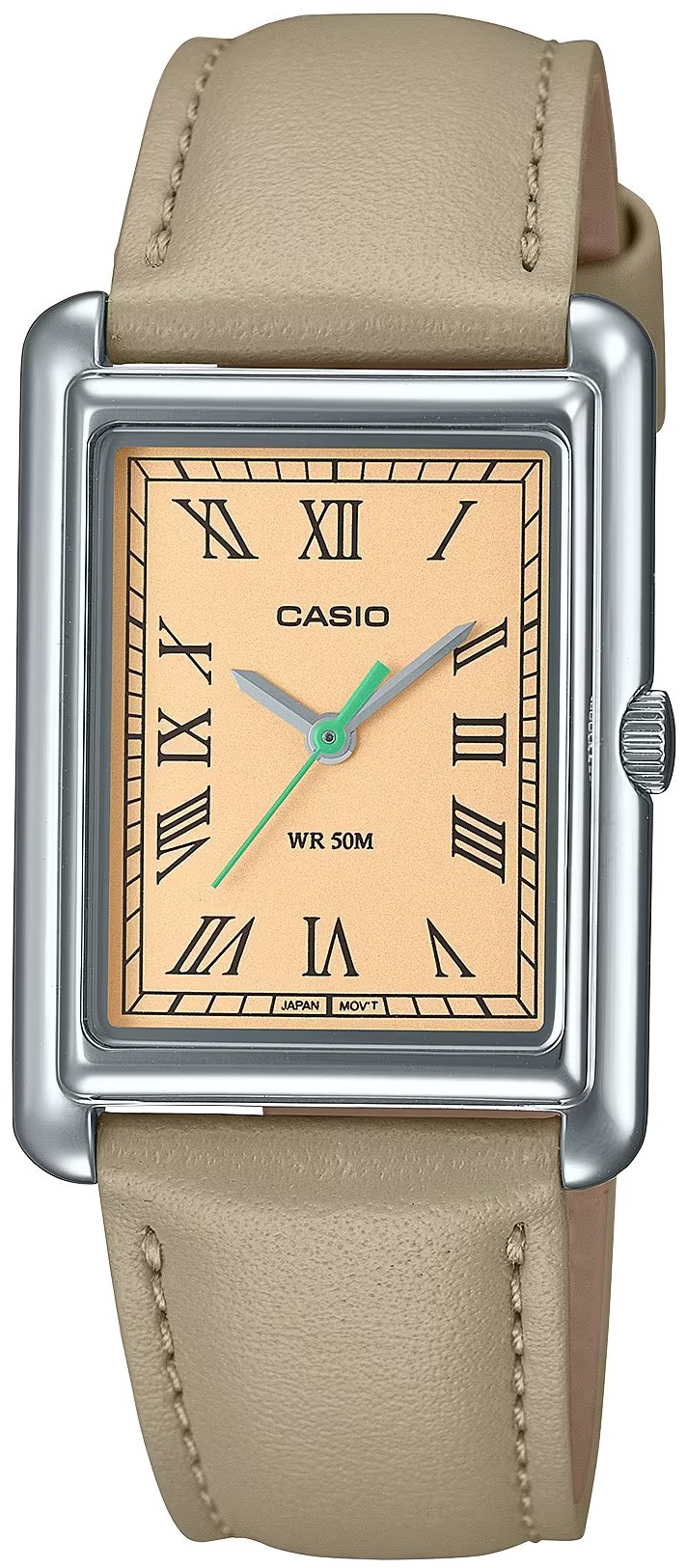 Casio Collection LTP-B165L-5BVEF to elegancki damski zegarek kwarcowy z prostokątną stalową obudową o wymiarach 24,5 x 34,5 milimetrów, płynnie połączoną z beżowym skórzanym paskiem zapinanym na sprzączkę. Pomarańczowa tarcza z czarnymi cyframi rzymskimi jest chroniona szkłem mineralnym. Wodoodporność zegarka wynosi 5 ATM, dzięki któremu jest odporny na zachlapania i zachlapania i opady.